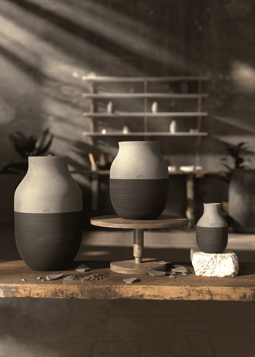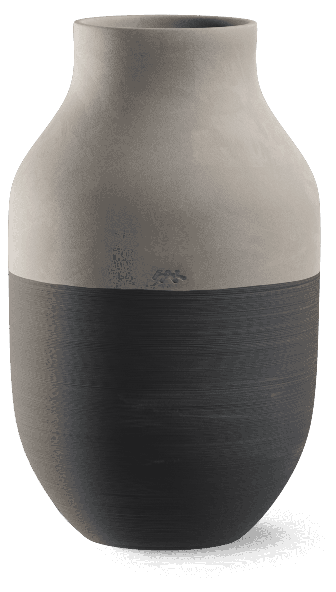 Den kendte og elskede Omaggio-vase fra Kähler er tilbage i en version produceret af restmaterialer fra tidligere produktioner, der ellers ville være gået til spilde. Under titlen Omaggio Circulare er det nye, spændende materialevalg med til at give den populære vase et nutidigt og fremsynet perspektiv med fokus på at reducere miljøpåvirkningen. Formen er som vi kender den med de bløde, organiske linjer, der kendetegnede den moderne Kähler-klassiker skabt i samarbejde med designerne Ditte Reckweg og Jelena Schou Nordentoft, der sammen designer under navnet Stilleben. De formgav Omaggio-vasen tilbage i 2007. I 2024-udgaven har de givet den et helt nyt udtryk, når de med deres innovative tilgang til design sætter de cirkulære materialer på dagsordnen med Omaggio Circulare. Ligesom de to øvrige vaser i serien har den store vase på 30 cm et raffineret todelt design med en rå top i en naturlig grå, der har taget farve efter de genanvendte materialer, og en håndmalet antracitgrå, der lægger sig smukt på den nederste halvdel af vaserne og skaber tyngde og kontrast. Alle dele i Omaggio-serien er designet til at passe sammen indbyrdes, og det giver et interessant og dekorativt udtryk, når de nye Omaggio Circulare-vaser sættes sammen med andre Omaggio-vaser, urtepotter og lysestager i forskellige størrelser og farver – nogle måske helt uden blomster, planter og lys så designets skulpturelle linjer får lov at tale for sig selv.