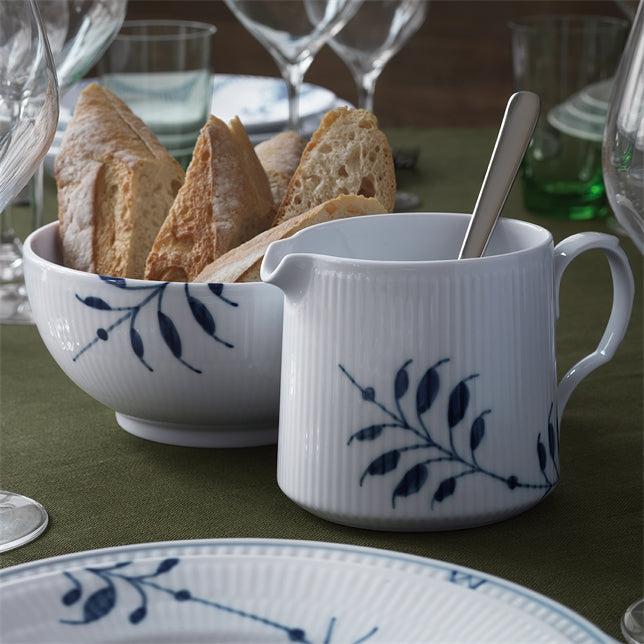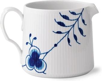 Denne kande fra Blå Mega Riflet-stellet har et nyt og anderledes udtryk med forstørrede, håndmalede elementer af en stiliseret krysantemum og palmette. Porcelænskanden rummer 70 cl, og sat på en lille tallerken vil den også være en smuk saucekande. Blå Mega Riflet er på en gang velkendt og forfriskende. Stellet er født af en modig nyfortolkning af det ikoniske Musselmalet Riflet og fortryller med sine grafiske og forstørrede sektioner af det musselmalede mønster. Siden Blå Mega Riflet blev designet i 2000 er stellet vokset sig til en ny klassiker inden for dansk design, og det iøjnefaldende stel er smukt i sig selv og i kombination med særkollektionen Mega Rose eller andre Royal Copenhagen stel.