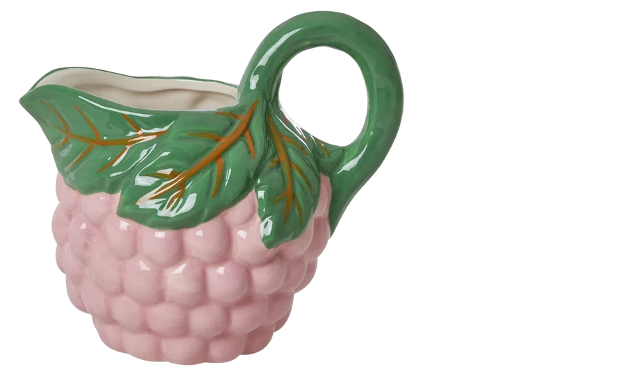 Dit kaffebord har aldrig set bedre ud med vores finurlige, lille, lyserøde keramik mælkekande... helt uundværlig til servering af mælk eller fløde! Kanden er formet som et bær med grønne blade på toppen og et praktisk håndtag i forlængelse – den perfekte kombination af funky og funktionalitet!