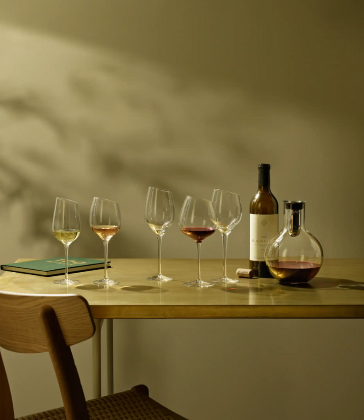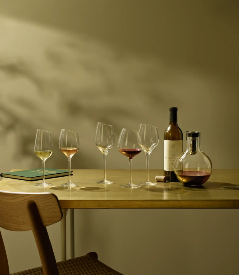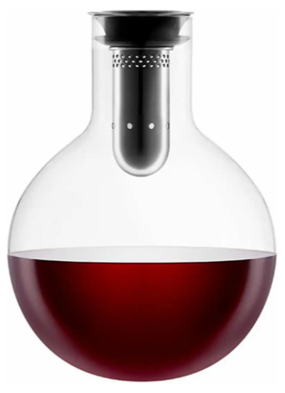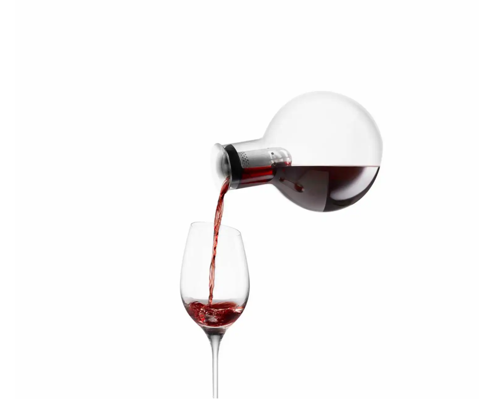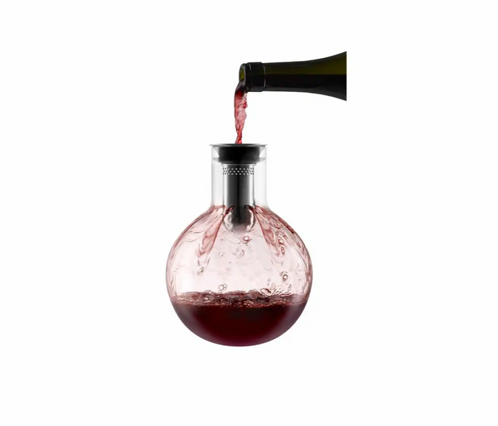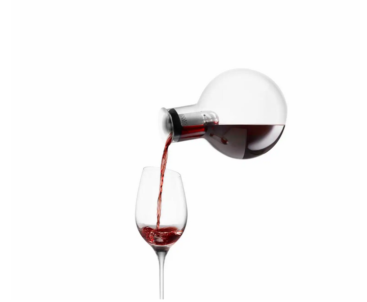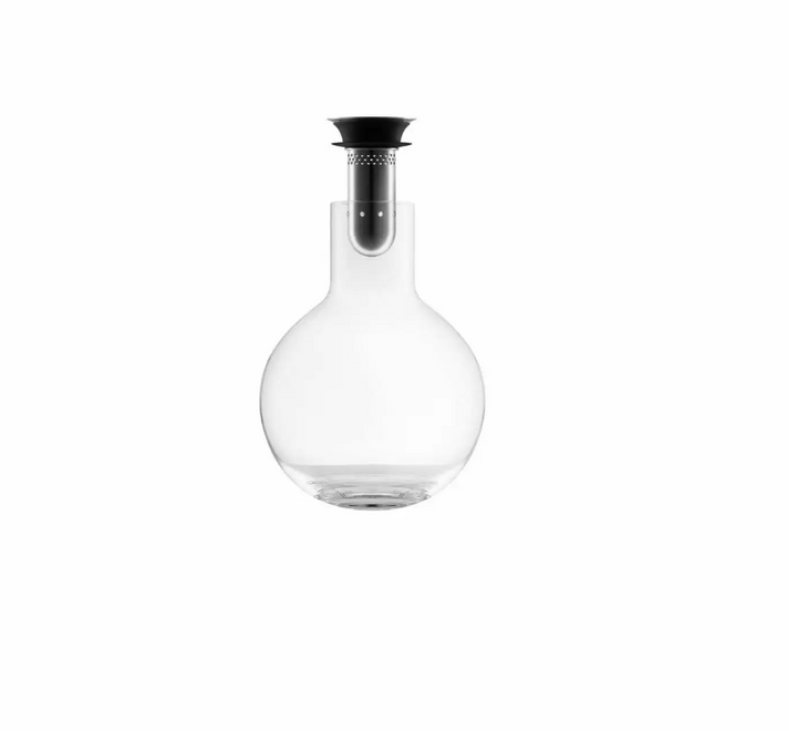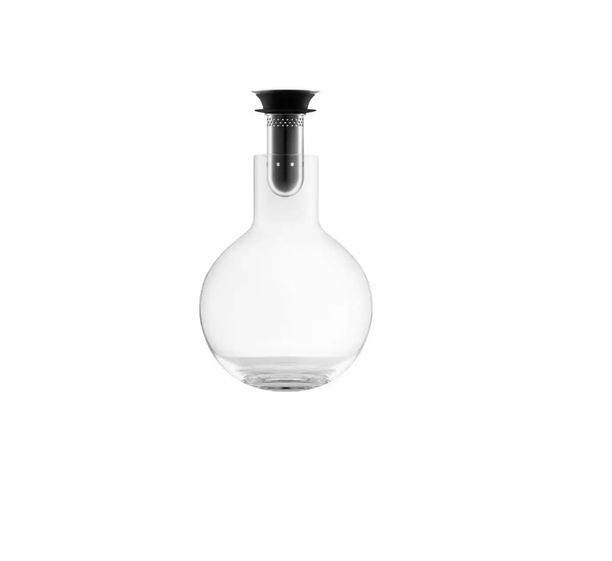 Dekanteringskaraflen dekanterer vinen skånsomt gennem den integrerede tragt. Tragten er perforeret, og når vinen løber igennem de mange små huller og fortsætter ned langs karaflens inderside, iltes den nænsomt og effektivt på smukkeste vis. Karaflen er fremstillet af mundblæst glas, og hver karaffel er derfor unik.