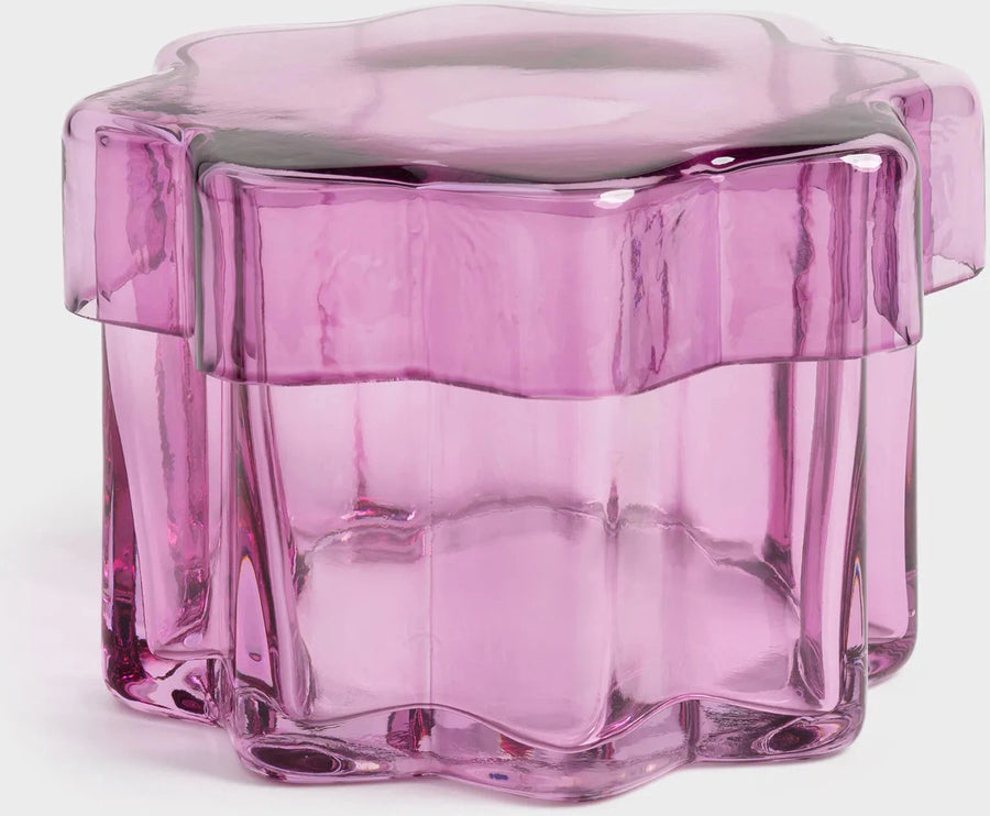 The delicate jar can be used to store beloved items at home. The coloured glass combined with the geometric shapes provides a stylish appearance. The matching lid is designed to keep your belongings safely stored inside.