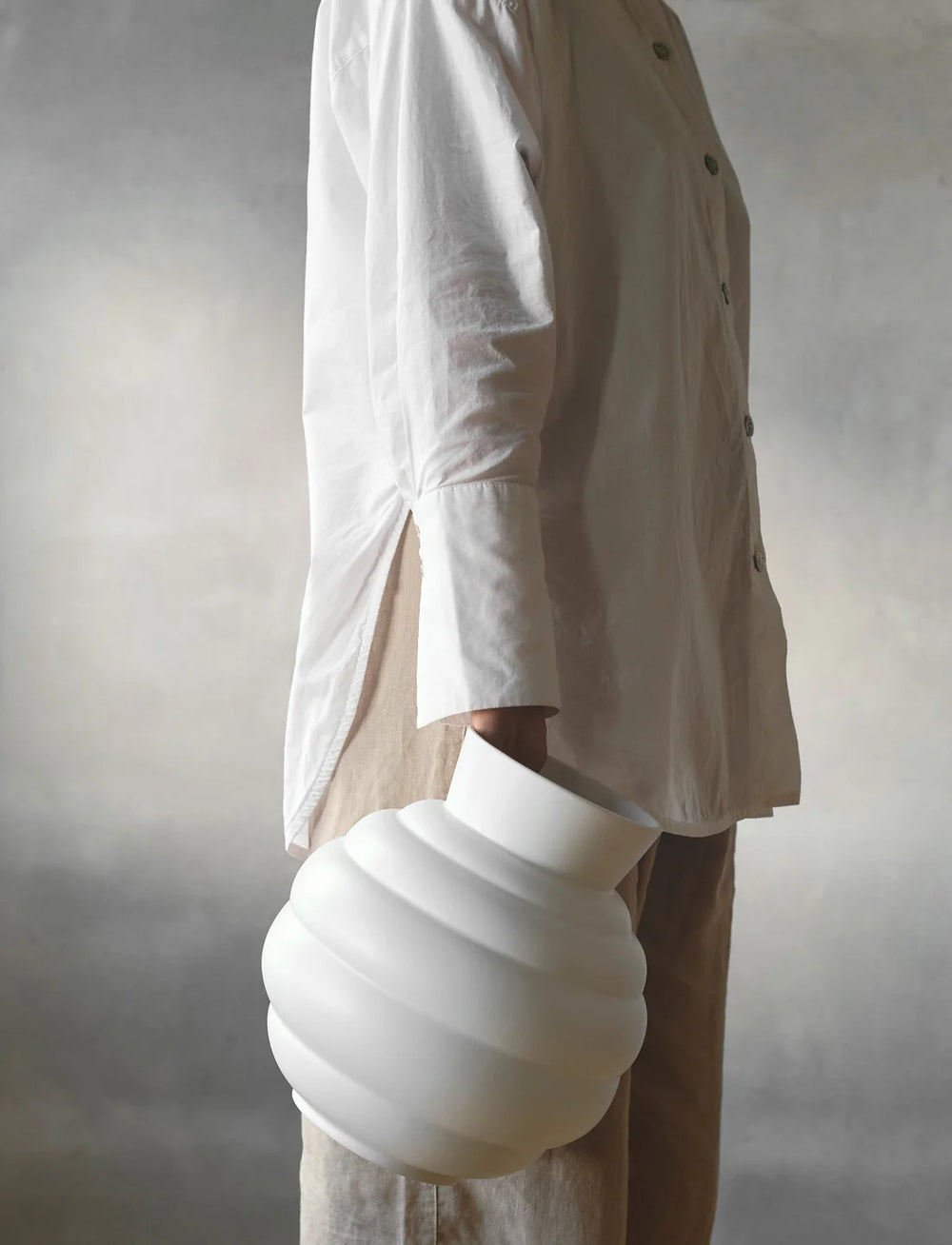 Archie is an exclusive vase collection from Knabstrup Keramik, created in collaboration with renowned ceramicist Eric Landon, also known as Tortus. The collection features 5 vases, all based on original pieces thrown by Eric in his studio in Østerbro, Copenhagen. With their flowing curves and sculptural form, the vases radiate elegance – whether displayed with or without flowers. The name Archie refers to the soft arches that give the series its organic and architectural character. Each vase has its own size and shape, yet they are all united by a shared design DNA that creates a harmonious whole. The series is crafted in glazed ceramic (faience) and produced in Portugal by a family-owned ceramics manufacturer, where craftsmanship and quality are key.