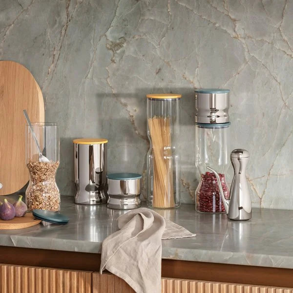 Ideelt til opbevaring af alt fra spaghetti til havregryn, mel og kaffe. Dette opbevaringsglas fra Alfredo kollektionen løfter stilen i ethvert køkken og er designet af Alfredo Häberli for Georg Jensen. Opbevaringsglasset har et grønt låg i rustfrit stål, som er lufttæt og sørger for, at maden hele tiden holder sig frisk. Vær opmærksom på, at opbevaringsglasset ikke er egnet til opvaskemaskine.