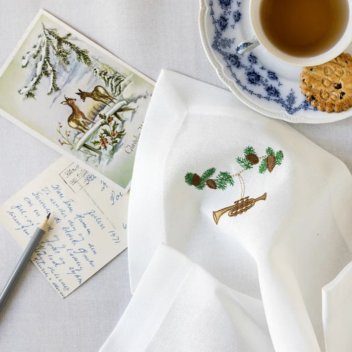 Eksklusiv juleserviet, syet i ægte, hvid flagdug, flot og unikt broderet med motiv af trompet på grankvist med kogler. En flot serviet, som vil pynte på ethvert julebord.