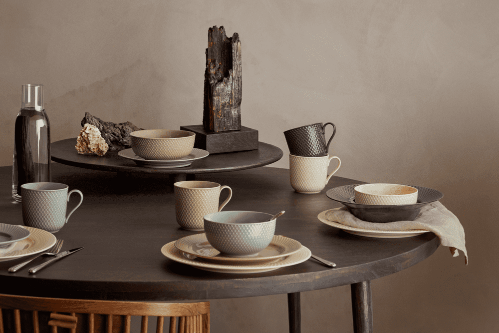 Et jordnært og nærværende udtryk på bordet og i hånden. Med en farvepalet i fire elegante jordfarver inviterer Rhombe Earth os til at sætte farten ned, være nærværende omkring det vi spiser og drikker, dem vi spiser med og at lægge mærke til skønheden i det stel, vi spiser og drikker af. Seriens krus på 39 cl er perfekte til en stor kop kaffe, te eller varm kakao og kommer ud over denne beigefarvede marble også i de tre andre Rhombe Earth-farver – clay, moss og slate – afdæmpede jordfarver der bringer Rhombe-stellets ikoniske reliefmønster frem på en ny og anderledes måde og indbyder til, at vi går et lag dybere og giver opmærksomhed til din drik i kruset og maden på tallerkenen, til sanserne og til samtalen med de andre omkring bordet. Alle Rhombe Earth-seriens fire smukke nuancer er ligesom i Lyngby Porcelæns populære Rhombe Color-serie nøje udvalgt af designduoen Stilleben, der består af Ditte Reckweg og Jelena Schou Nordentoft. Brug alle de forskellige Rhombe Earth-dele sammen i din borddækning og lad de forskellige størrelser tallerkener titte frem under hinanden, så de lune farver får lov at tale sammen. Tallerkenerne, krusene og skålene i Rhombe Earth er selvfølgelig også både sammen og hver for sig oplagte som supplement til din Rhombe Color-samling eller i kombination med det klassiske hvide Rhombe-stel, hvor de grå og brune nuancer på de enkelte Rhombe Earth-dele sammen med Lyngby Porcelæns linjer til perfektion vil skabe et både moderne og afslappet udtryk og stå smukt op imod det hvide porcelæn.