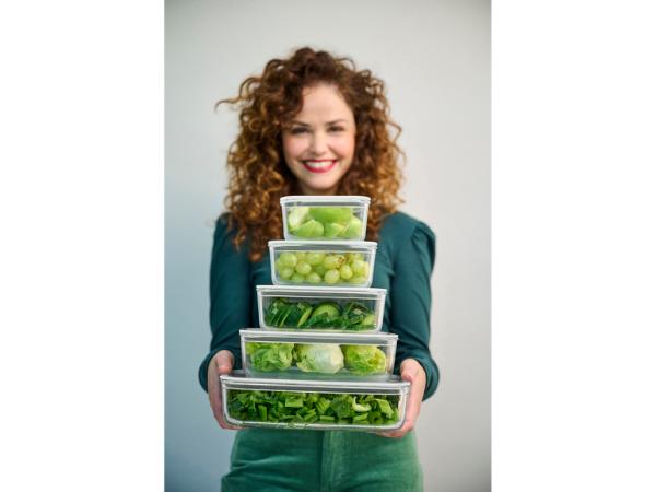 Alle bokse, uanset rumfang, har samme højde. Det optimerer opbevaringen og minimerer spildplads, når boksene stables i køleskab og fryser.