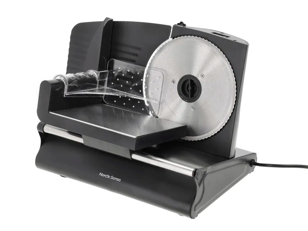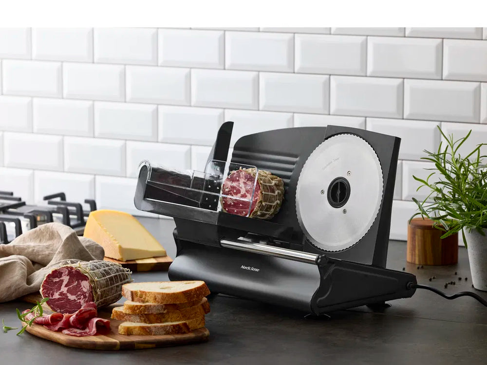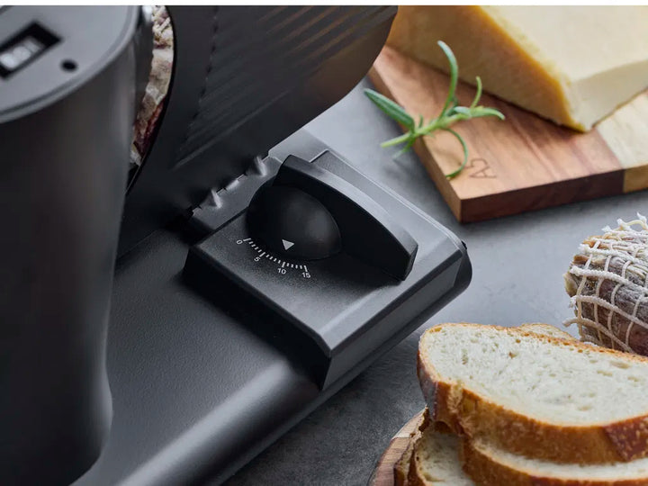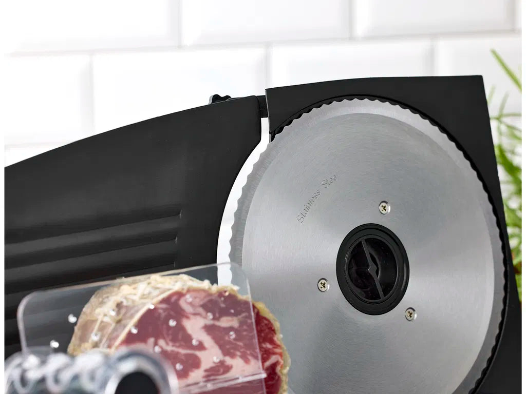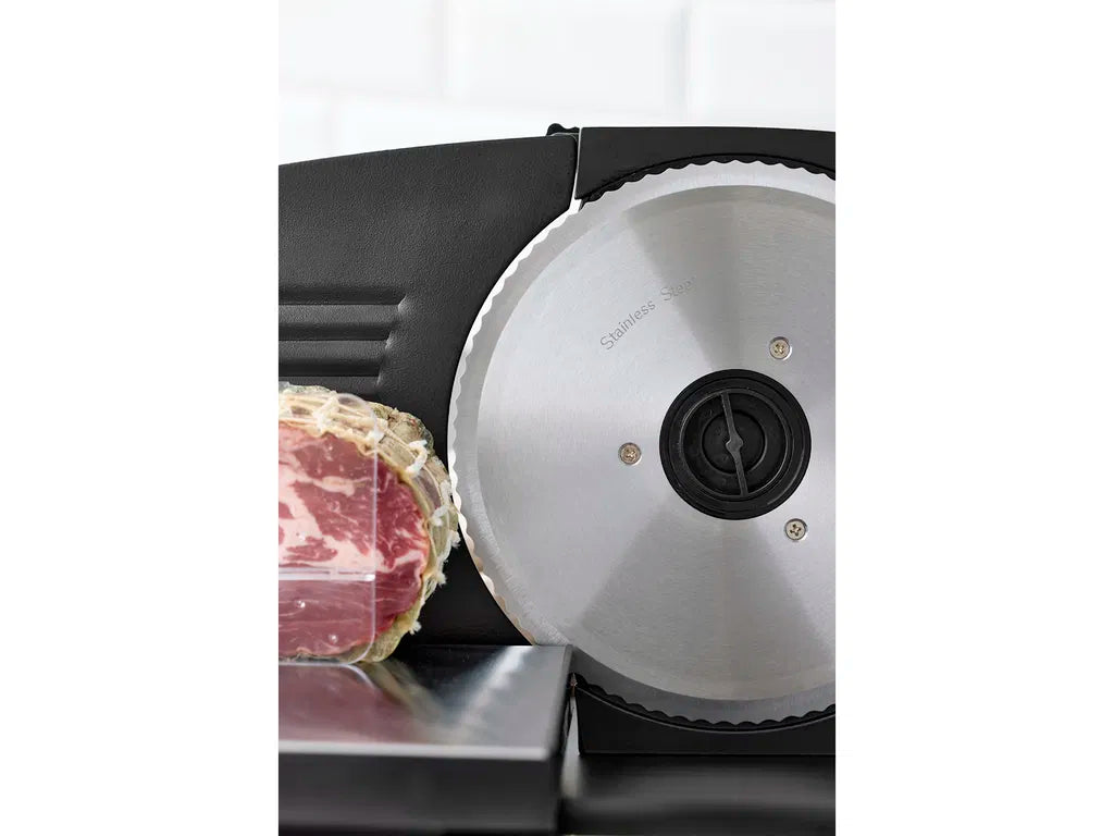 Skær præcise skiver af pålæg, kød og brød – lige som du vil have dem. Den takkede klinge i rustfrit stål sikrer gode skiver hver gang, og skæretykkelsen kan justeres fra 0 til 15 mm. Pålægsmaskinen har to hastigheder, som giver dig fuld kontrol over arbejdet, og de skridsikre fødder sørger for, at den står stabilt på køkkenbordet. Kort om pålægmaskinens funktioner: • Til både pålæg, kød og brød • 19 cm klinge i rustfrit stål • Justerbar skæretykkelse fra 0 til 15 mm • 2 hastigheder