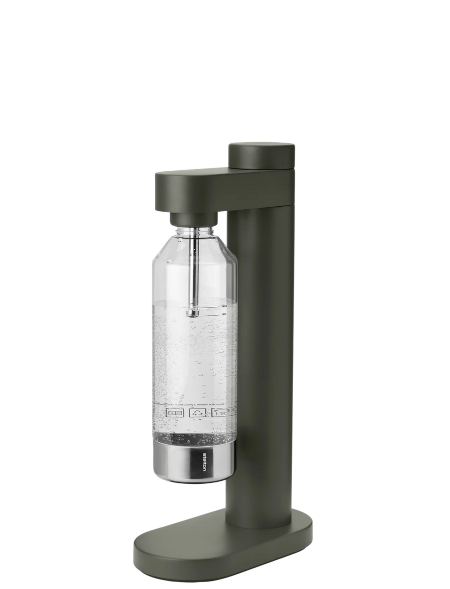 Med Brus kulsyremaskine sparer du miljøet for store mængder af unødigt plast ved at lave din egen danskvand eller sodavand i genanvendelige flasker. Designet af sodavandsmaskinen er så elegant, at du kan glæde dig over at have den stående fremme på køkkenbordet. Designeren bag, Søren Refsgaard er kendt for sit rene funktionelle design, hvor alt overflødigt er skåret væk. Det er Brus et særdeles godt eksempel på. Designet trækker på de cylindriske former, der er klassisk for Steltons design. Den cylindriske form ses først og fremmest i den ultraslanke beholder til kulsyrepatronen og går igen i kulsyreknappen, der intuitivt drejes med uret for at tilpasse mængden af kulsyre og drejes kontra, når flasken skal løsnes fra maskinen. Brus kulsyremaskine leveres med et styk Brus flaske.