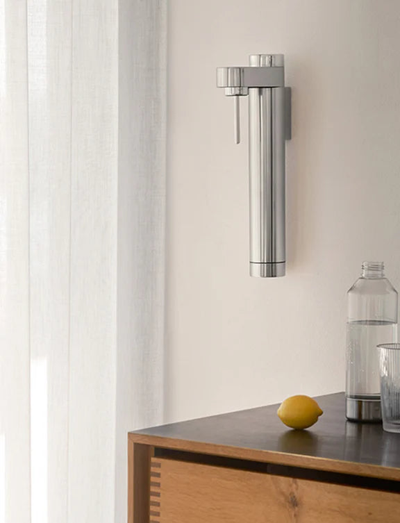 Steltons væghængte Brus i kombinerer smukt design med miljøvenlig funktionalitet. Skab din egen danskvand eller sodavand i genanvendelige flasker og reducer dit plastforbrug. Den elegante sodavandsmaskine er designet af Søren Refsgaard, der er kendt for sit rene og funktionelle design, hvor overflødighed er skåret væk. Brus' cylindriske former, inspireret af Steltons klassiske designtradition, ses tydeligt i den slanke beholder til kulsyrepatronen og den intuitive kulsyreknap.