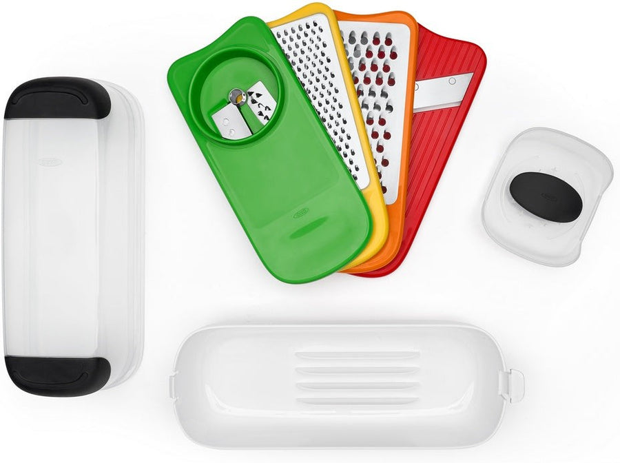 The Spiralizer creates uniform vegetable noodles out of zucchini, carrots and more, the slicer yields uniform slices of fruits and veggies, the medium grater makes fluffy shavings of hard cheeses and chocolate, and the coarse grater is perfect for semi-soft cheese, butter, onions and more.