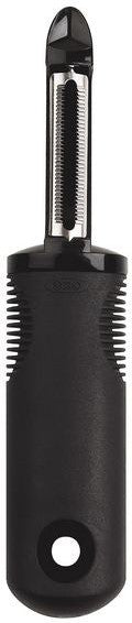 Peel the skins off slippery and waxy fruits and vegetables with the OXO Good Grips Serrated Peeler. Perfect for peeling tomatoes, peaches, plums and more, the sharp, serrated, stainless steel blade catches onto fruits and vegetables with ease and peels through their skins effortlessly.