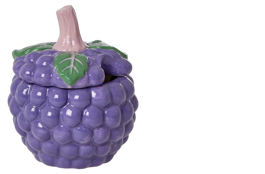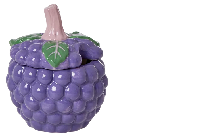 Den sødeste, lille, lavendelfarvede keramik marmeladekrukke formet som et bær! Denne charmerende krukke kommer med et låg med grønne blade og et lille hul til en ske. Den er ikke kun til marmelade - forestil dig de uendelige muligheder! Brug den til opbevaring af små skatte, servering af tilbehør, eller endda som dekoration!
