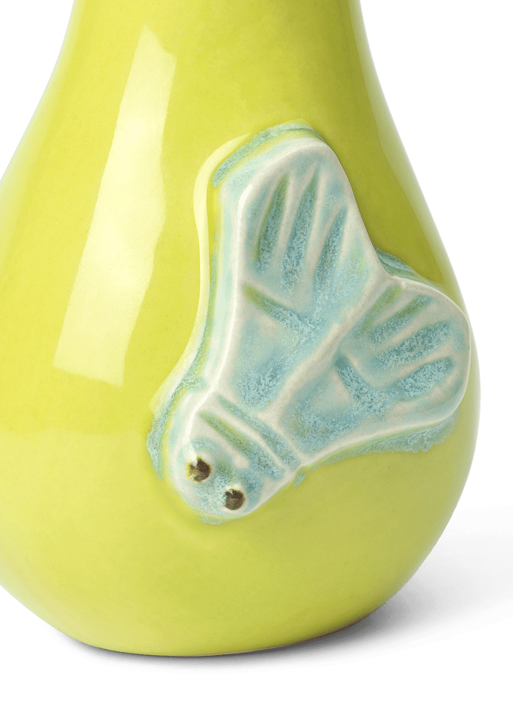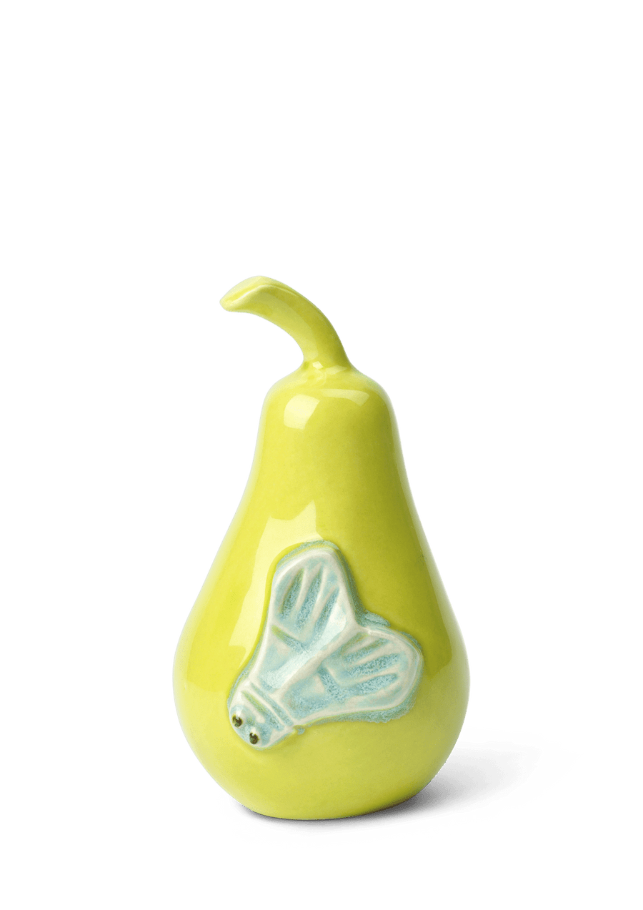 Farverig popkultur møder håndlavede designtraditioner. I deres fælles kærlighed til keramik har designduoen KIMPOP, der tæller de farverige personligheder Sofie Linde og Joakim Ingversen, arbejdet tæt sammen med Kähler om at designe en kunstnerisk kollektion, der både er rebelsk og autentisk – og som kommer direkte fra hjertet. Hele Kähler X KIMPOP Poppery-kollektionen funkler i et dristigt og selvsikkert mix af farverige pasteller, opulente glasurer, humoristiske detaljer og former, der skiller sig ud fra mængden og inviterer os til at tage flere farverige chancer i indretningen. Nyd blot denne æblegrønne pære prydet med en skøn mintfarvet natsværmer på siden – en finurlig lille figur du ikke vidste, du manglede. Poppery-pæren måler 11 cm i højden og er en skæv og sjov del af Poppery-kollektionen og et perfekt eksempel på KIMPOPs humoristiske tilgang til unikt og levende design, der til fulde omfavner både det keramiske håndværk og passionen for pop og populærkultur – et forunderligt lille keramikkunstværk der emmer af livsglæde og højt humør.
