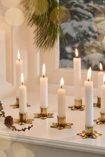 Denne stjerneformede stage, som er en del af Ib Laursens 'Gloria'-serie af messingpynt, er lavet i ægte messing. Messing er et blødt materiale og kræver derfor forsigtig håndtering. Farven på messing kan have forskellige nuancer, og det kan ændre farve efter berøring samt ved luftens påvirkning, hvilket er med til at give det en flot patina. Pudsemiddel til messing kan bruges til rengøring, men det skal bruges med forsigtighed.