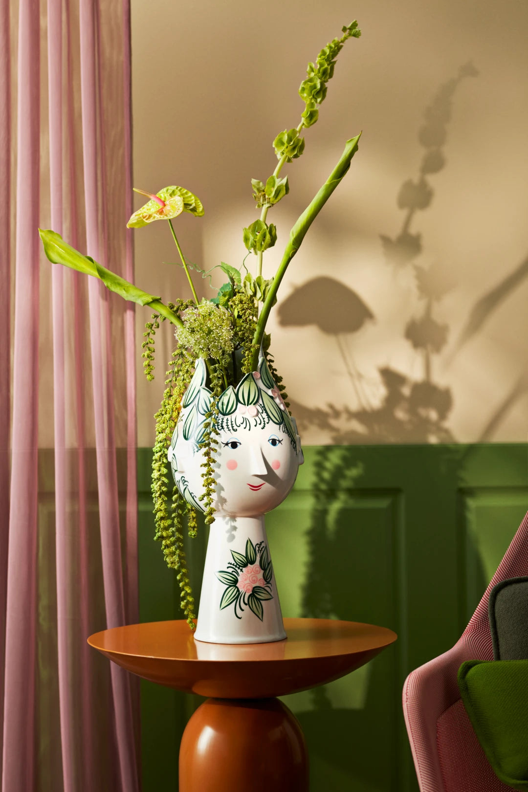 Et håndmalet eventyr i den kreative bolig. Med den skulpturelle Titania-serie fra Bjørn Wiinblad får du et poetisk og farverigt mesterværk til den legende indretning med et skørt, skævt og forunderligt udtryk baseret på Bjørn Wiinblads ikoniske designarv og med referencer til en af historiens mest klassiske komedier. Med inspiration fra William Shakespeares ’En skærsommernatsdrøm’ giver Titania-serien dig også følelsen af at være med i et episk eventyr. Og det er da også som om, at Titania næsten ikke kunne hedde andet. Navnet Titania er nemlig både inspireret af feernes dronning i ’En skærsommernatsdrøm’, og så blev Titania-navnet også brugt af Bjørn Wiinblad selv, da han tilbage i tiden skabte en række fantasifulde figurer, som den nye Titania-serie bygger videre på. Titania-vasen med en højde på 50 cm er præget af en frisk grøn nuance i smuk kombination med røde og lyserøde detaljer. Det unikke ved Titania er især hendes håndmalede hår skabt med en mangfoldighed af maleriske blade i forskellige formationer, der stilfuldt og skulpturelt både bølger og bevæger sig i alle retninger rundt på det blankpolerede keramik – op, ned, rundt om ørerne, markeret med smukke relieffer, og ned ad nakken. Håret på denne vase er grønt og prydet med de yndigste små røde og lyserøde roser – en udsmykning der her også har fundet vej til hendes hals. Øjnene er de karakteristiske mandelformede. Kinderne er de velkendte runde og rosa. Og du finder naturligvis også den ikoniske trekantede næse, der stikker ud i en markant spids, hvorunder et sæt finurlige læber fuldender Titanias poetiske ansigt. Det er næsten som om, at hun med sit forsigtige og lidt drillesyge smil lige er ved at fortælle os sin store hemmelighed, men så alligevel beslutter sig for at holde den for sig selv lidt endnu. Serien er en hyldest til det overdådige og drømmende – med skulpturelle former, fabulerende frisurer og betagende botanik med blade og blomsterdekorationer, der stråler af kunstnerisk kreativitet og storslået skønhed. Alt sammen håndmalet med en exceptionel kunstnerisk dedikation i den klassiske og helt unikke Wiinblad-stil. Et håndmalet mesterværk – skabt til at skabe plads til glæde.