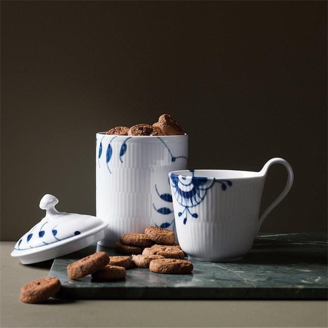 En forstørret, håndmalet blomst og palmette draperer sig ned ad siderne på højhankskoppen i det iøjefaldende Blå Mega Riflet-mønster. Koppen på 33 cl kan fyldes med varme drikke til kolde dage og stille morgener. Blå Mega Riflet er på en gang velkendt og forfriskende. Stellet er født af en modig nyfortolkning af det ikoniske Musselmalet Riflet og fortryller med sine grafiske og forstørrede sektioner af det musselmalede mønster. Siden Blå Mega Riflet blev designet i 2000 er stellet vokset sig til en ny klassiker inden for dansk design, og det iøjnefaldende stel er smukt i sig selv og i kombination med særkollektionen Mega Rose eller andre Royal Copenhagen stel.