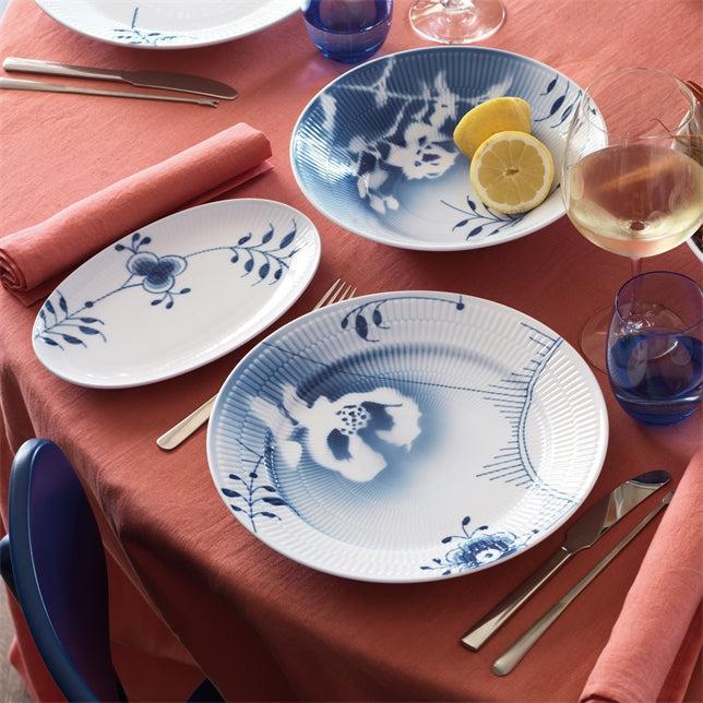Dette lille Blå Mega Riflet Fad på 23 cm kan bruges som et lille serveringsfad eller en smuk sidetallerken til brød og andet ved middagsbordet. Uanset hvordan fadet bruges, passer det kontemporære mønster naturligt ind i enhver borddækning med sine håndmalede blomsterdekorationer. Blå Mega Riflet er på en gang velkendt og forfriskende. Stellet er født af en modig nyfortolkning af det ikoniske Musselmalet Riflet og fortryller med sine grafiske og forstørrede sektioner af det musselmalede mønster. Siden Blå Mega Riflet blev designet i 2000 er stellet vokset sig til en ny klassiker inden for dansk design, og det iøjnefaldende stel er smukt i sig selv og i kombination med særkollektionen Mega Rose eller andre Royal Copenhagen stel.