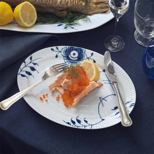 Kanten med de elegante hvide rifler bliver fremhævet af det håndmalede mønster fra Blå Mega Riflet på denne ovale tallerken. Tallerkenen på 28 cm er en iøjefaldende middagstallerken, som også kan fungere som et serveringsfad. Blå Mega Riflet er på en gang velkendt og forfriskende. Stellet er født af en modig nyfortolkning af det ikoniske Musselmalet Riflet og fortryller med sine grafiske og forstørrede sektioner af det musselmalede mønster. Siden Blå Mega Riflet blev designet i 2000 er stellet vokset sig til en ny klassiker inden for dansk design, og det iøjnefaldende stel er smukt i sig selv og i kombination med særkollektionen Mega Rose eller andre Royal Copenhagen stel.