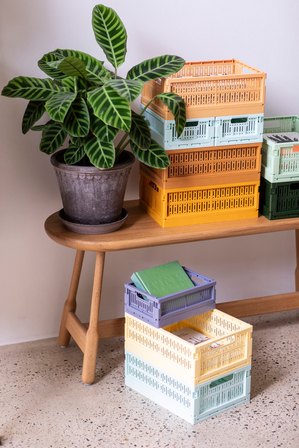 Kassarnir kunnu stáplast. Tveir mini kassar á ein midi kassa, og tveir midi kassar á ein maxi kassa.