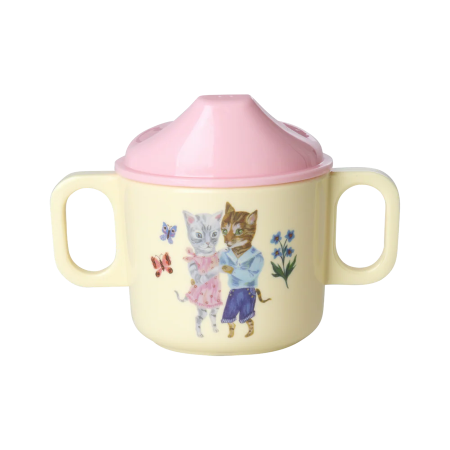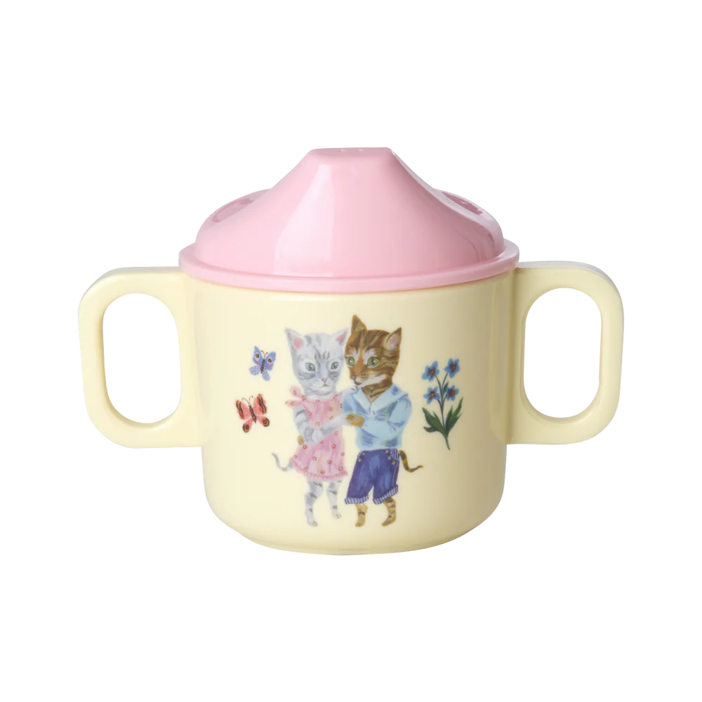 Praktisk babykop med et lyserødt låg og de sødeste dansende katte designet af den talentfulde franske kunstner Nathalie Lété. Koppen er lavet af melamin, hvilket er holdbart og ideelt til daglig brug på grund af dets styrke og lette rengøring. Det absorberer ikke farve eller smag fra maden – helt perfekt til en lille starterkop. Vær opmærksom på, at produktet ikke er egnet til mikroovn.