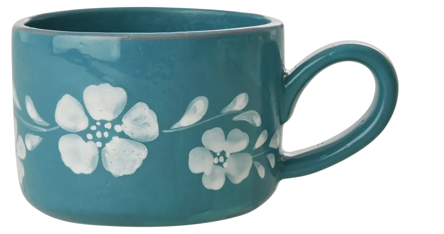 Smuk cappuccinokop med hvide blomsterranker på en blågrøn baggrund. Koppen er lige så unik, som du er. Den er håndmalet af en gruppe fantastiske portugisiske kvinder, hvilket gør hver enkel kop helt unik. Vi synes det er så charmerende!