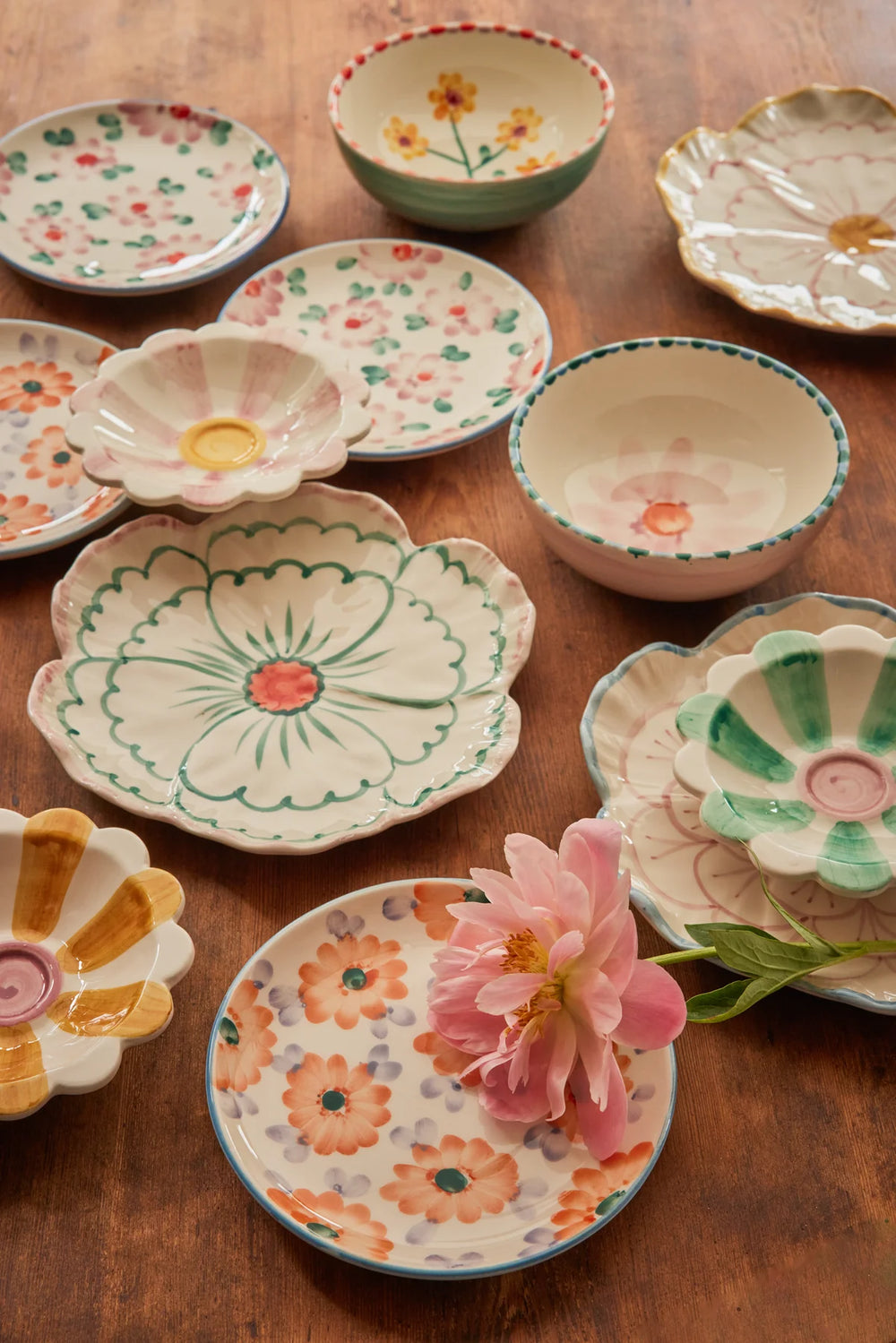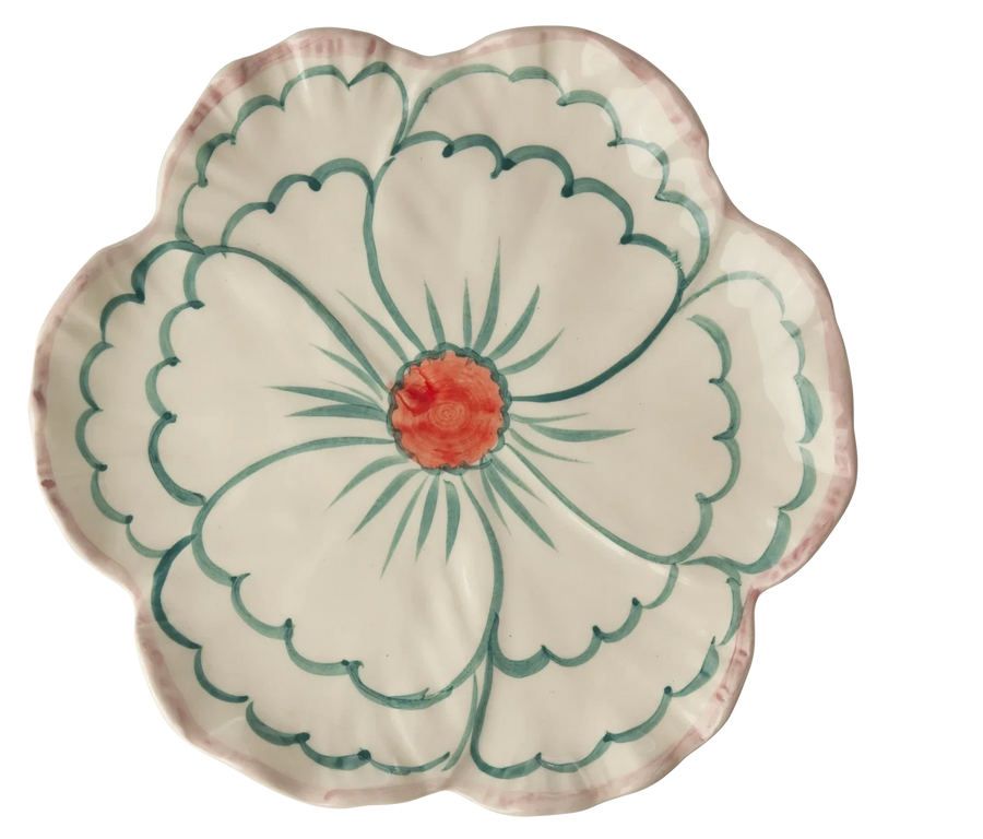 Dæk et smukt bord med denne skønne blomstertallerken eller brug den som et fint serveringsfad. Den er beriget med håndmalede detaljer i grøn og lyserød, malet af fantastiske kvinder i Portugal. Derfor er to tallerkner ikke ens, men derimod helt unik.