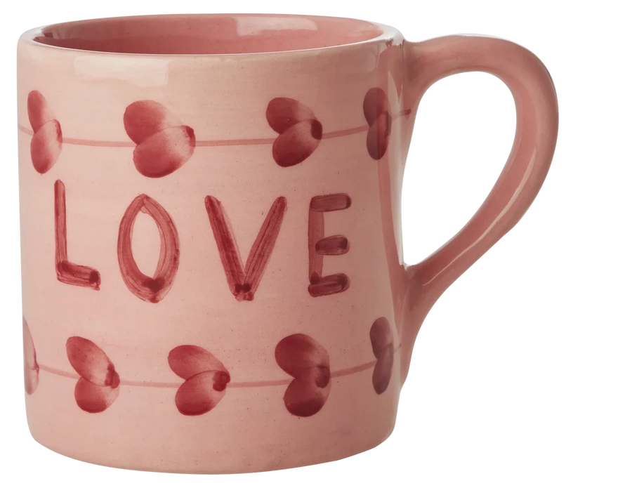 Sødeste kaffekrus lavet i keramik med håndmalede hjerter og ordet "love" skrevet i midten. Koppen er håndmalet af en gruppe fantastiske portugisiske kvinder, hvilket gør hver enkel kop helt unik. Vi synes det er så charmerende!
