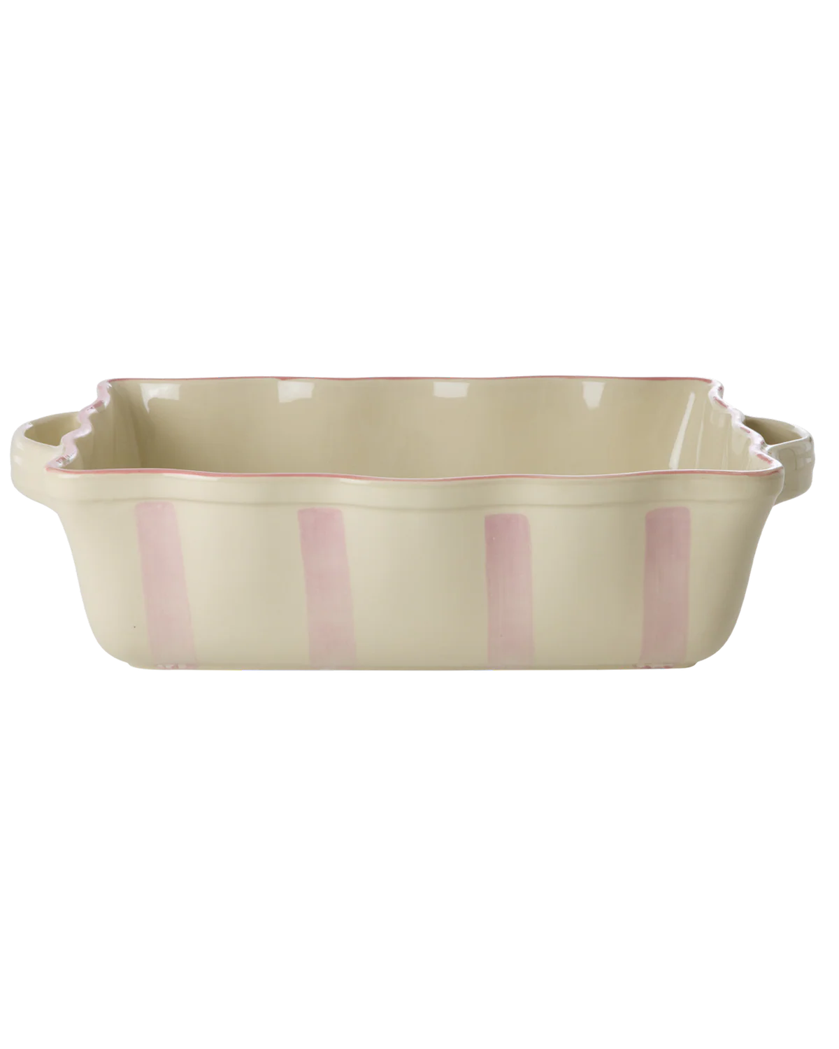 Stort og smukt ovnfast keramikfad… fadets skønne lyserøde striber og koralfarvede kanter er alle malet i hånden af talentfulde kunstnere – hvilket også betyder, at hvert eneste fad er fuldstændig unikt! Når man køber keramik, må små revner forventes, da materialet er "levende" og altid vil "arbejde".