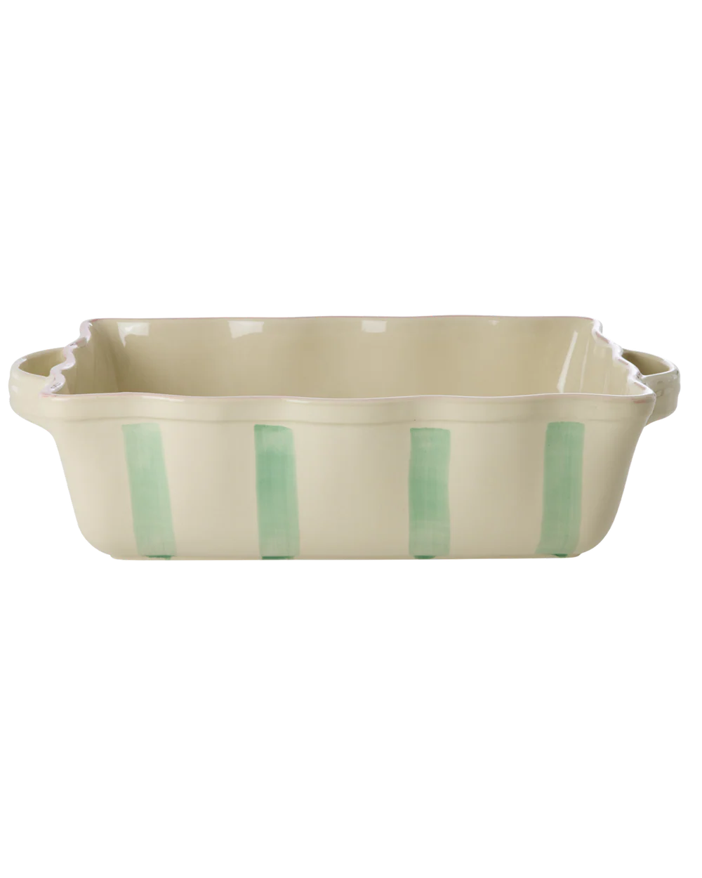 Stort og smukt ovnfast keramikfad… fadets skønne grønne striber og lyserøde kanter er alle malet i hånden af talentfulde kunstnere – hvilket også betyder, at hvert eneste fad er fuldstændig unikt! Når man køber keramik, må små revner forventes, da materialet er "levende" og altid vil "arbejde".