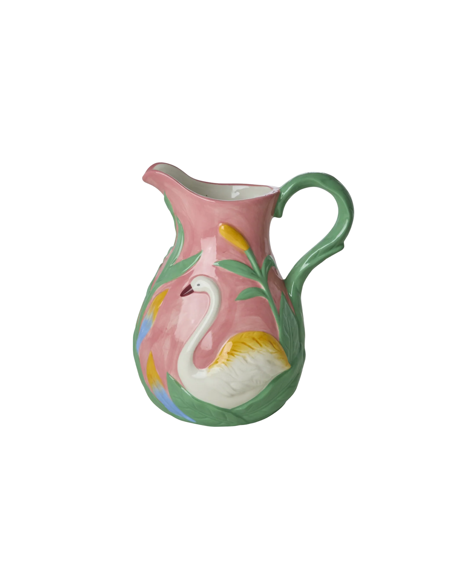 Skøn og finurlig kande i en sød lyserød og grøn farve. Kanden er lavet af keramik og er pyntet med en flot svane. Den kan rumme op til 1,4L og er god til næsten alt; som vandkande til middagen, juice til brunchen eller vin til aftensmaden. Du kan også købe en buket af dine yndlingsblomster og bruge kanden som en vase!