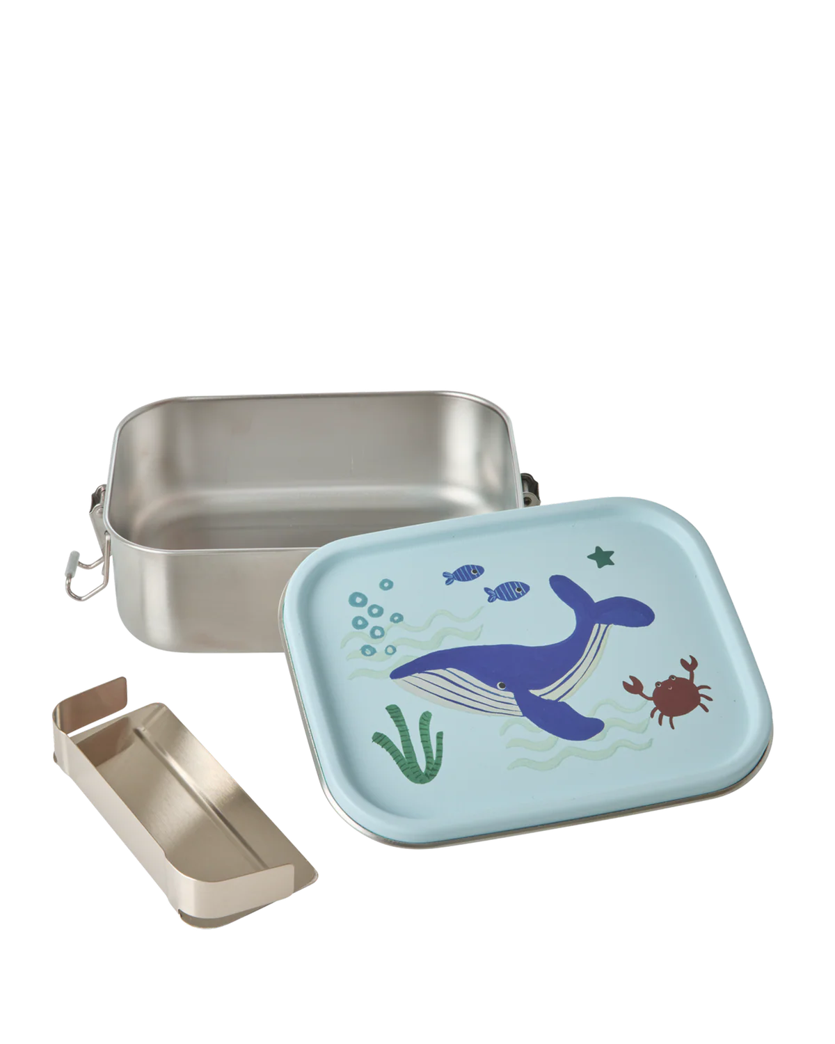 Gør kedelige rugbrødsmadder spændende med vores skønne madkasse i rustfrit stål! Den kommer med det sødeste koralfarvede låg med havdyr og en flytbar rumdeler – helt perfekt til at holde madpakken organiseret og frisk!