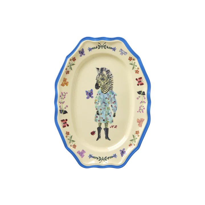 Server dine lækre retter på et smukt, retroinspireret serveringsfad. Det er fyldt med sjove og funky detaljer – som en ualmindelig velklædt zebra og søde sommerfugle… alt sammen designet af Nathalie Lété. Fadet er lavet af melamin og måler W19 x L26 cm. Melamin er holdbart og ideelt til daglig brug pga. dets styrke, lette rengøring og evne til ikke at absorbere farve eller smag fra maden