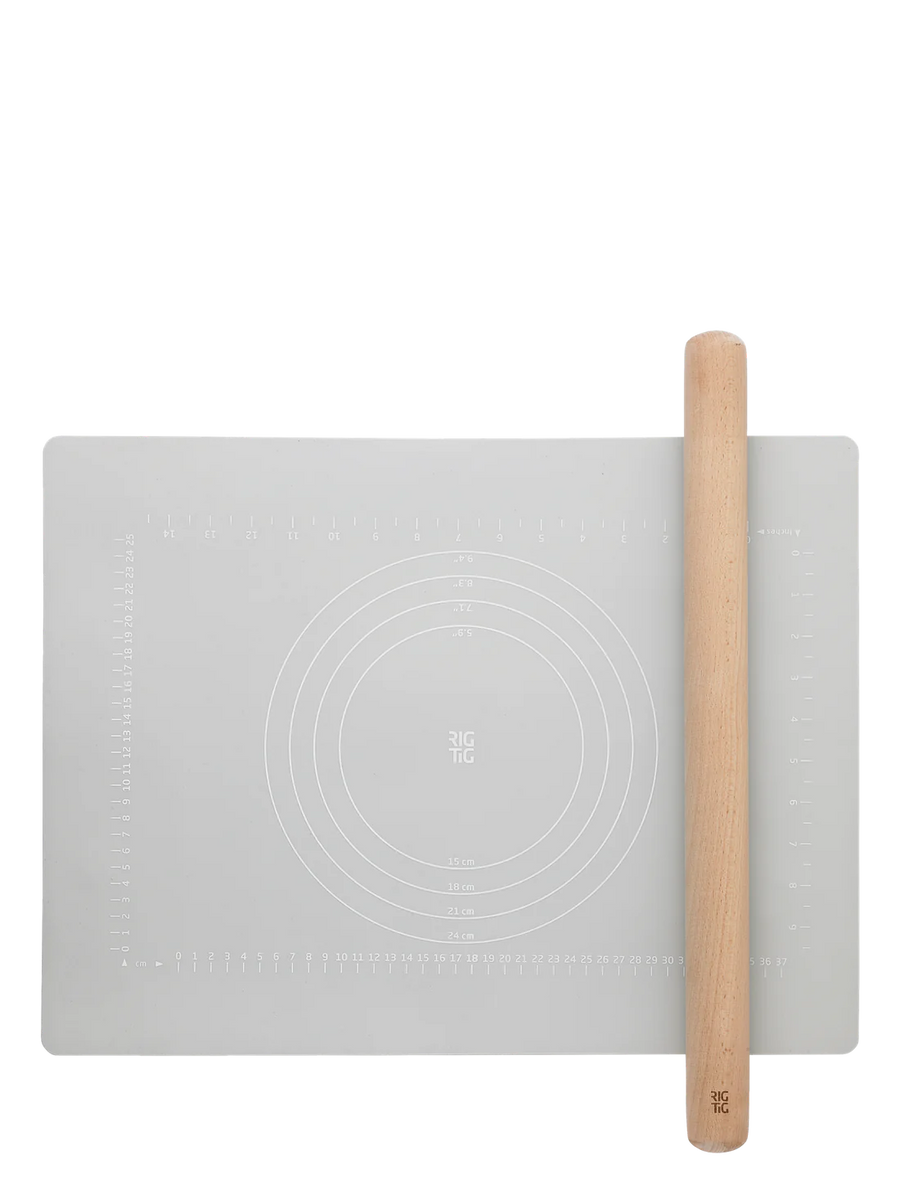 Ease up your cooking and baking with RIG-TIG’s new BAKE-IT rolling pin and baking mat that prevents the dough from sticking to the table. The baking mat can withstand oven up to 230 degrees, so roll out your dough on the baking mat and put it directly in the oven – that way you save on the dishes. Printed on the side of the mat, there are centimetre measurements and in the middle, rings in different sizes, helping you make the perfect round pizza, pie, bread or cake. The baking mat can be cleaned in the dishwasher or easily wiped with a wet cloth. When both parts have been cleaned and dried, the baking mat is simply rolled around the rolling pin with the elastic band holding the parts together. BAKE-IT can then be placed in the drawer where it takes up very little space.