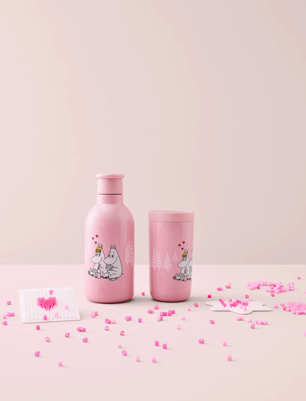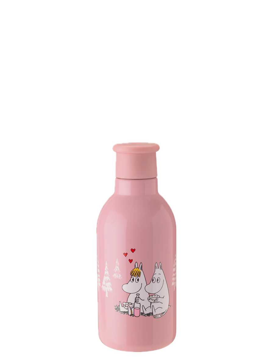 Moomin love comes from the comic strip “Moomin and the Comet.” The illustration shows Moomintroll and Snorkmaiden sitting and enjoying a bottle of Moominmamma’s elderberry juice.
