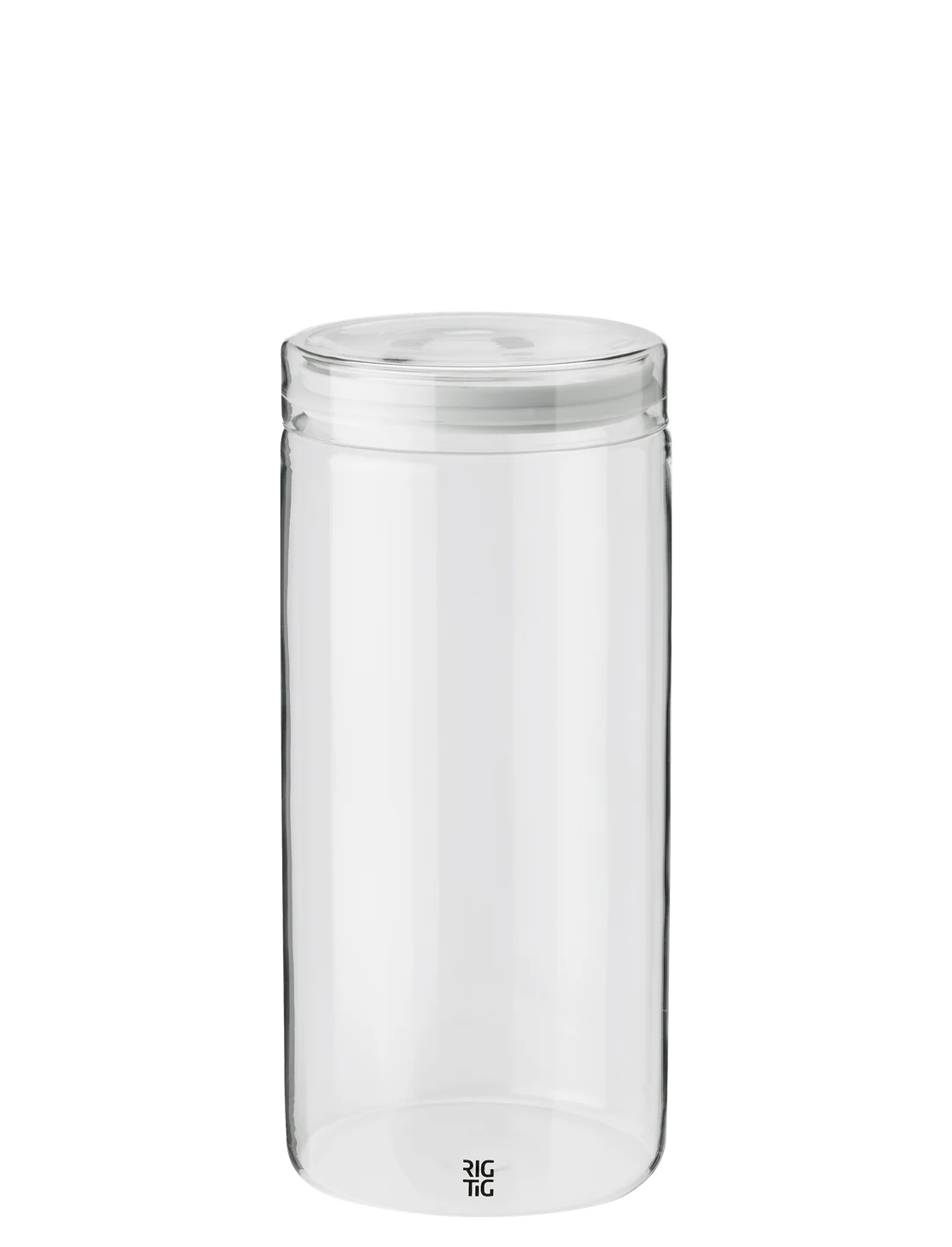 STORE-IT storage jars are designed to store dry foods such as oats, pasta and grains in the kitchen. The minimalist, cylindrical design does not take up much space in a drawer, cabinet or on the shelf, and the transparent glass makes it easy and quick to determine the contents. The silicone ring ensures airtight lid closure so that the contents do not emit odours or absorb flavours from other food products. The jars can also be used in the fridge to store jam, chutney or leftovers.