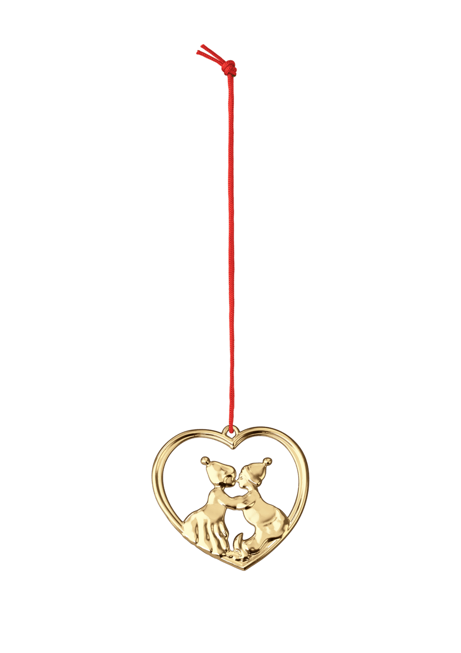 Klassisk julepynt med kunstnerisk kant. Rosendahls Karen Blixens Jul er for mange indbegrebet af den hyggelige og traditionelle jul – fuld af historie og julesymbolik, der får juleglæden til at holde helt indtil juleaften. Ole Kortzau lavede sin første Karen Blixen-julepynt tilbage i 2007. Og hvert år kommer der nye ophæng til i den særlige håndlavede kvalitet skabt med omhyggelighed og øje for detaljen i en sådan grad, at hvert enkelt ophæng fremstår som et lille kunstværk i sig selv, belagt med ægte sølv og guld. 2025-kollektionen indeholder blandt andet dette forgyldte hjerte med to kyssende nisser, der yndigt og svævende tilføjer den magi til december, der gør juletiden til noget helt særligt. Hjertet med de to kyssende nisser er et nærværende og kærligt julemotiv inspireret af de hjertevarme følelser, der dukker op hos mange af os i julen – et ikonisk symbol på julens hjertelighed og det kærlige samvær med vores kære i juletiden. Ophænget måler 6,5 cm i højden og fungerer både alene og sammen med de andre små ophæng i serien – perfekt som både vinduespynt og på juletræet. Motiverne i Karen Blixens Jul er ofte en kærlighedserklæring til børnenes perspektiv på julen. Men selvom Ole Kortzaus julehistorier tager udgangspunkt i virkeligheden, så er de ikke virkeligheden. Derfor er der også altid lige puffet lidt til motiverne. De er altid lidt skæve, lidt underfundige. Ole Kortzau vil have os til stoppe op, tage en pause – og nyde de særlige øjeblikke og opdage alle de klassiske karakterer på en anden måde. Dette juleophæng leveres med en fin rød snor.