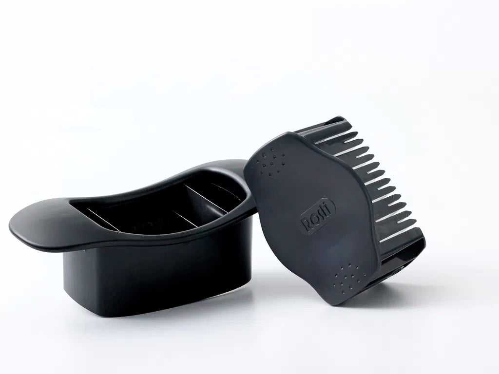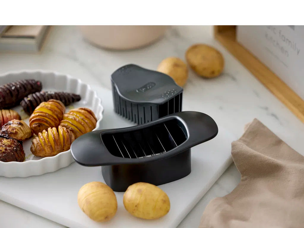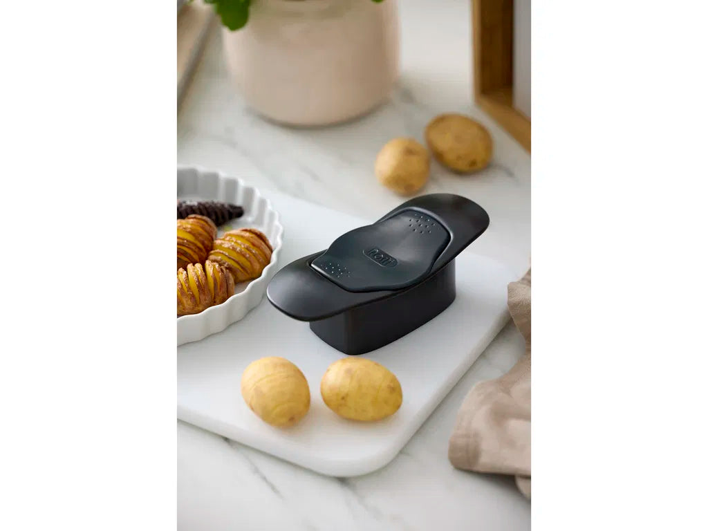 Hasselback-skæreren fra Rosti er et hurtigt og effektivt redskab til at skære skarpe og regelmæssige riller i kartofler og andre rodfrugter. Uanset om du forbereder klassiske Hasselbackkartofler eller eksperimenterer med grøntsager som pastinak eller tomat, opnår du nemt hurtige og imponerende resultater. Hasselback-skæreren består af to dele, dels en ramme med store håndtag og fastmonterede knive i form af skarpe lameller af rustfrit stål, dels et låg, der passer ned i rammen. Kartoflen lægges på skærebrættet, hasselback-skæreren placeres hen over den og presses ned. Herved skærer knivene dybe riller i kartoflen uden at skære helt igennem. Låget løftes opad i bevægelsen, og når du trykker det ned igen, skubbes kartoflen fri af knivene. Nu har kartoflen eller en anden grøntsag flotte, skarpe riller. Så enkelt er det. Design: mencke&vagnby. 5 års garanti. Hasselbackkartofler er en klassisk svensk ret, der stammer fra restauranten Hasselbacken i Stockholm, hvor retten blev opfundet i midten af 1950’erne. Retten er enkel og blev efterfølgende populær i svenske hjem og er sidenhen udbredt ikke bare ud over Skandinavien, men i resten af Europa samt Nordamerika og Australien. Hasselbackkartofler er kendetegnet ved, at kartoflen skæres næsten helt igennem i tynde skiver, der åbner sig under bagningen, hvilket giver sprøde, chipsagtige kanter og en blød midte. Serveringsmulighederne er mange, fra en helt enkelt servering med smør og salt til fyldigere ingredienser som ost, krydderurter, hvidløg, rasp og bacon. • Dansk design • Skærer perfekte Hasselback-snit på få sekunder • Velegnet til kartofler, rodfrugter, tomater og meget mere • ABS og rustfrit stål • Tåler opvaskemaskine • L 19,2 cm, B 8 cm, H 5,5 cm