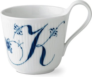 Referencerne til det musselmalede mønster er tydelige på dette Alfabet højhankskrus på 33 cl med bogstavet ’K’. På den modsatte side af koppen gemmer sig en stiliseret palmette og krysantemum, der, ligesom det elegante bogstav, er håndmalet på de hvide rifler. Inspirationen til Royal Copenhagens Alfabet Kollektion blev fundet i Royal Copenhagens store bagkatalog af håndmalede dekorationer og klassiske stel. Hver kop og tallerken i Alfabet Kollektionen er sirligt dekoreret i hånden, og hver enkelt steldel er en oplagt gaveidé med en helt personlig betydning for en du har kær.