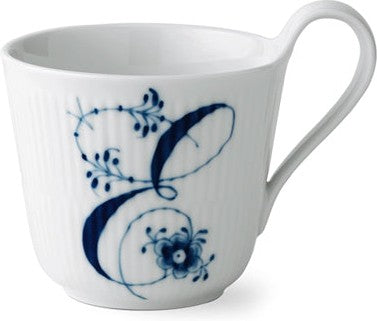 Håndmalede palmetter og en lille krysantemum hægter sig fast på de snoede stængler, som danner bogstavet ’E’, på dette elegante Alfabet Højhankskrus på 33 cl. Mønsteret er inspireret af det klassiske mønster fra Musselmalet Riflet og skaber en personlig borddækning. Inspirationen til Royal Copenhagens Alfabet Kollektion blev fundet i Royal Copenhagens store bagkatalog af håndmalede dekorationer og klassiske stel. Hver kop og tallerken i Alfabet Kollektionen er sirligt dekoreret i hånden, og hver enkelt steldel er en oplagt gaveidé med en helt personlig betydning for en du har kær.