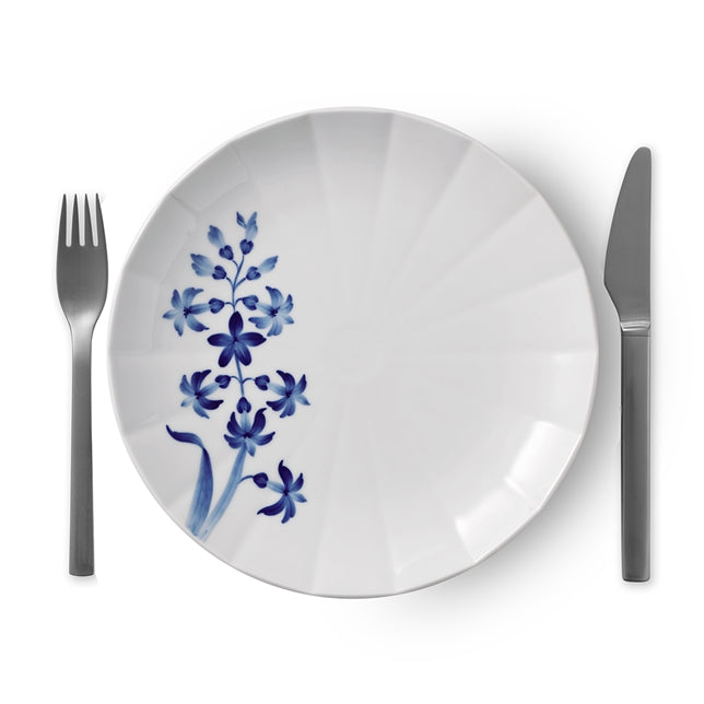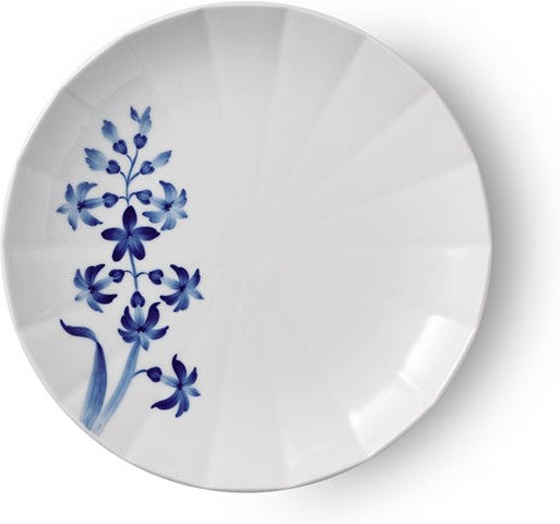 Med sin frodige, håndmalede dekoration og skarpe designsprog får denne blomst Tallerken på 22 cm et organisk udtryk. På tallerkenen vokser en håndmalet hyacint livligt fra tallerkenens kant og bedårer med sine delikate, små blomsterstande. Tallerkenen er ideel som frokosttallerken eller til den store morgenmad. De bedste designs fremstår ofte ubesværede, ukomplicerede og helt igennem naturlige. blomst er et smukt eksempel på netop dette, og i det iøjnefaldende stel er bragt til verden med særlig opmærksomhed på kombinationen af formsprog, design og placering af de blå penselstrøg for at opnå et kontemporært udtryk. Hver steldel er udsmykket med sin egen, unikke blomsterdekoration.