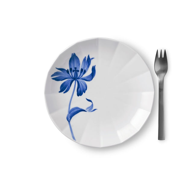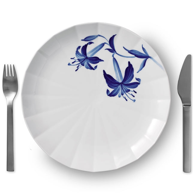 Den yndefulde lilje strækker sine støvdragere på den vinklede Coupe-Tallerken på 27 cm fra blomst-stellet. Liljen er håndmalet i en dragende teknik, der skaber en dramatisk og livlig dekoration. Tallerkenen er ideel som middagstallerken eller et serveringsfad på et veldækket bord. De bedste designs fremstår ofte ubesværede, ukomplicerede og helt igennem naturlige. blomst er et smukt eksempel på netop dette, og i det iøjnefaldende stel er bragt til verden med særlig opmærksomhed på kombinationen af formsprog, design og placering af de blå penselstrøg for at opnå et kontemporært udtryk. Hver steldel er udsmykket med sin egen, unikke blomsterdekoration.