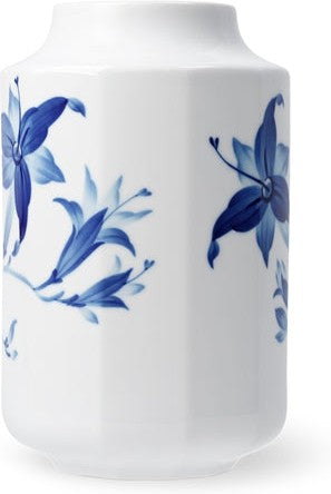 På denne åbne vase slynger bløde liljer sig om den brede sekskantede form - nogle i knop andre i blomstring. Vasen er oplagt til enhver slags buket – og i hvert nyt blomsterarrangement opstår der et spændende samspil mellem de levende vækster og de livagtige gengivelser.