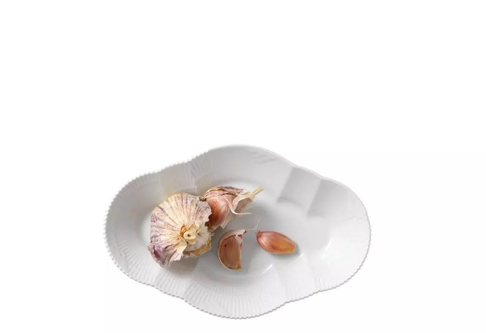 Dette Hvid Elements Fad på 23 cm charmerer ved første øjekast med sit særlige formsprog og inviterer dig nærmere for at opleve en inspirerende sammensætning af håndlavede detaljer. Fadets overraskende kombination af rifler, fiskeskælsdekorationer og den takkede kant fra det ikoniske Flora Danica-stel er et frisk pust til enhver samling, hvor det alsidige fad tilføjer et kontemporært udtryk. Brug fadet til serveringer eller som et flot opbevaringsfad til urter og andre ingredienser på køkkenbordet. I designet af Hvid Elements har Louise Campell skabt en charmerende og overraskende kombination af skattede designelementer fra Royal Copenhagens mest klassiske stel. I en ny fortolkning af traditioner er stellet udsmykket med riflerne fra Musselmalet Riflet, blondekanten fra Musselmalet Halvblonde og den takkede kant fra det ikoniske Flora Danica. Den overraskende brug af de klassiske elementer på det hvide porcelæn gør hver enkelt steldel helt unik.