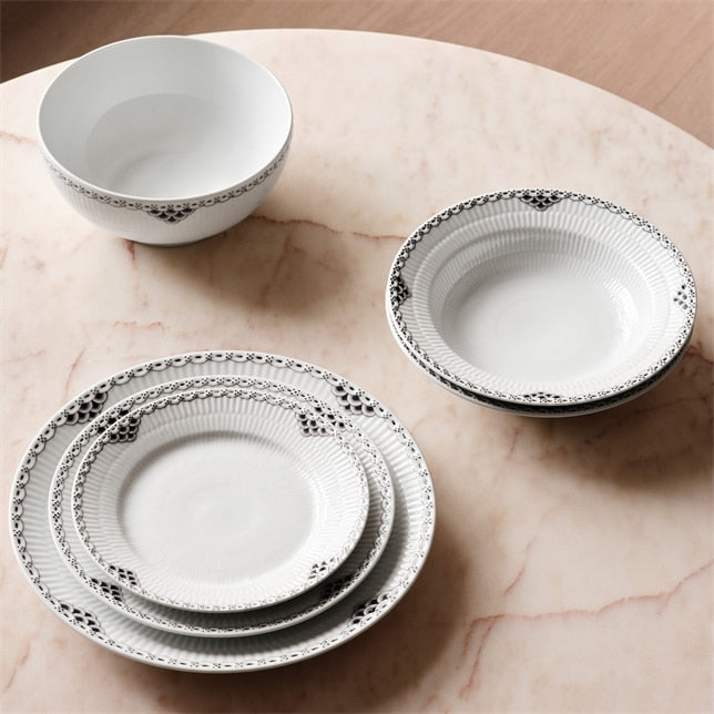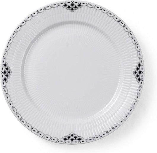 Underspillet elegance. To ord, der perfekt beskriver denne Sort Riflet Blonde tallerken. Sort Riflet Blonde er inspireret af Musselmalet Halvblonde fra 1888 og er kendetegnet ved den delikat dekorerede blondekant. Den hvide riflede overflade afbrydes kun af tallerkenens håndmalede kant - det perfekte valg til en elegant, men dog vovet middagstallerken.