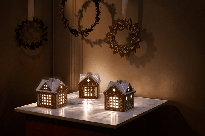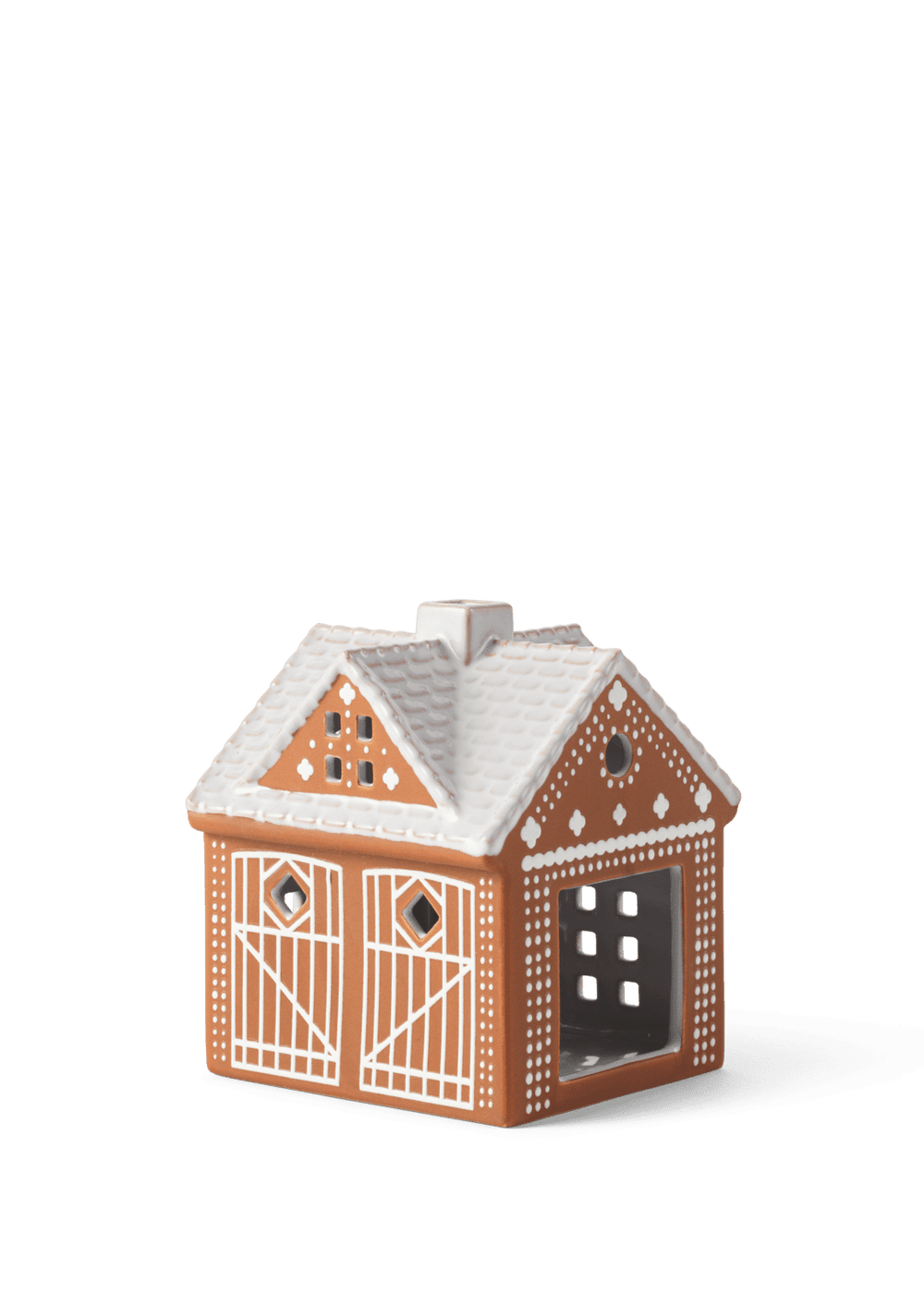 En smagfuld juleklassiker i håndlavet keramik. Kähler Gingerbread er en serie af moderne honningkagehuse og en julekrans fra Kähler, hvor kombinationen af et charmerende udtryk og håndlavede designtraditioner møder varmen fra fyrfadslysene og de klassiske juletraditioner, der skaber både stil og hygge. Bagværk hører julen til, og med sit naturtro udtryk er det det let at forestille sig, at Kähler netop har taget et nybagt honningkagehus ud af keramikovnen. Ja, du kan næsten dufte honningkagen, men tag ikke fejl – hele Gingerbread-serien er skabt i stentøj, og den hvide glasur er keramisk. Kähler Gingerbread Lyshus Julestald måler 11,5 cm i højden og er inspireret af en traditionel gammel lade, som du i dag ofte ser danne en både hyggelig og autentisk ramme for julemarkederne på landet – fulde af nostalgi og med garanti for røde kinder, friskbagte æbleskiver, julepynt, gløgg, strikkede vanter og brændte mandler til de alle besøgende familier og venner på juletur. Julestalden har sne på taget og er dekoreret med sirlige mønstre, som man ville dekorere et honningkagehus. I lyshuset er der god plads til et fyrfadslys, så julestemningen kan sprede sig gennem de håndskårne vinduer og staldens unikke kendetegn – de store trædøre med hvert sit lille vindue. Mette Bache og Barbara Bendix Becker er designerne bag Kähler Gingerbread, og deres formgivning er kendetegnet ved mødet mellem det stringente og det autentiske. Lyshusenes geometriske flader blødes op af de sirlige dekorationer og de mange vinduer og døre, der alle – stor som lille – er udskåret i hånden, så lyshusene får et naturligt og hyggeligt udtryk.