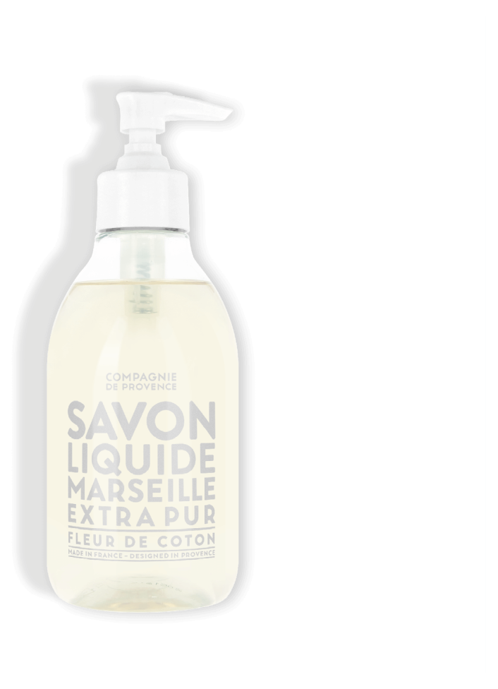 The liquid Marseille soap Cotton Flower fragrance in a convenient and unbreakable bottle.