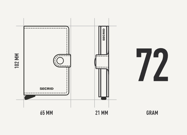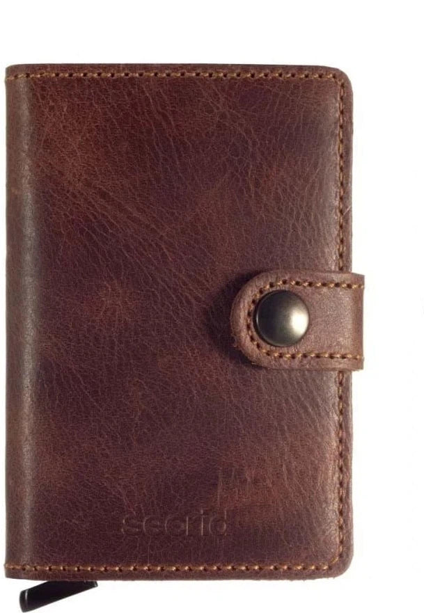 SECRID's mest ikoniske kortholder og den perfekte allrounder. Miniwallet er kompakt i størrelse og overraskende stor i kapacitet. Med en lang række stilarter og farver passer den til enhver lomme. Den patenterede mekanisme giver dig mulighed for at skubbe dine kort ud med en enkelt bevægelse, klar til øjeblikkelig brug. Aluminium beskytter mod bøjning, brud og uønsket trådløs kommunikation. Vores Vintage læder har en omhyggeligt slibet overflade. Voksen gør den mere følsom over for ridser, hvilket gør dette livlige læder mere personligt over tid. Miniwallet Vintage er korrigeret læder, fremstillet i Holland af europæisk kohud.