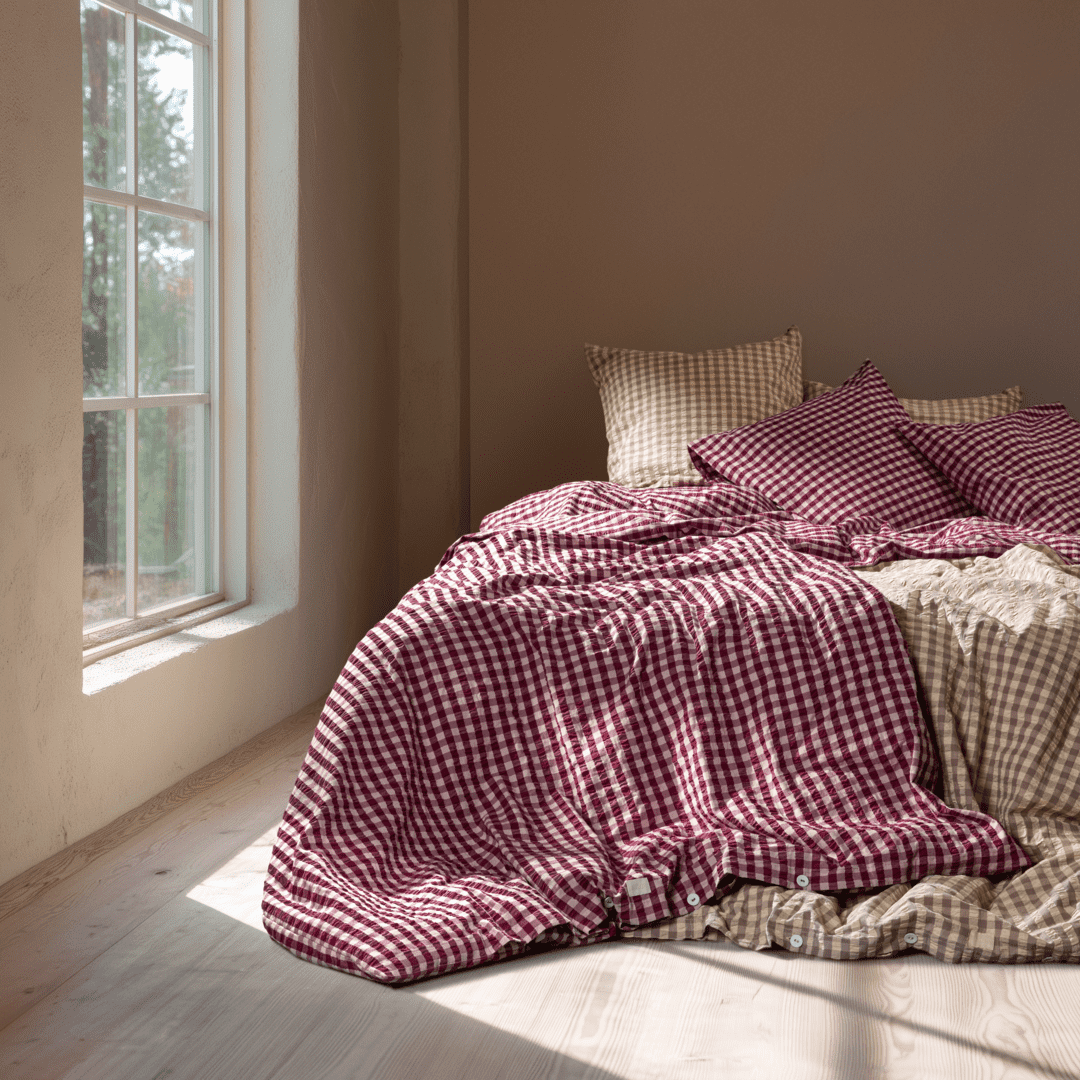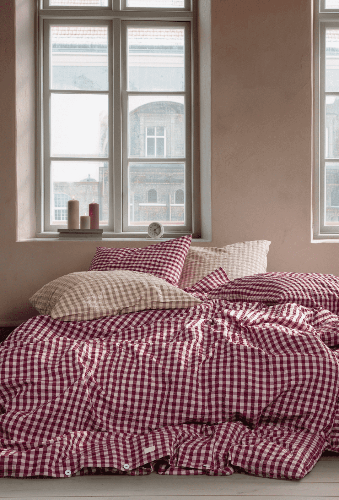 Sanseligt, behageligt, 100% økologisk og GOTS-certificeret. Sengetøjet Bæk&Bølge fra JUNA er produceret ud fra ansvarlige principper og har en helt speciel vævning med en tekstur, der vækker minder. Måske kan du huske følelsen af stoffet fra barndommen, bedsteforældrene eller sommerhusferierne? Ikke alene er der noget nostalgisk over materialet – det er også funktionelt og lader luften cirkulere mellem din hud og stoffet. Det kalder på en god nats søvn, så du kan restituere og lade op til en ny dag. Bæk&Bølge har det helt rigtige casual og naturlige udtryk, der præger tidens mode og indretningstrends. Mærk stemningen. Uperfekt på den helt perfekte måde. Sengetøjet til almindelige dyner måler 140x200 cm og kommer i farvekombinationen blomme/rosa, hvor dybde møder lethed i en smuk balance. Den mørke, forførende blommefarve tilfører et strejf af subtil luksus og sofistikeret varme, mens den støvede rosa nuance har en blød og beroligende karakter, der giver en følelse af harmoni og velvære. Inspireret af tidens længsel efter både eskapisme og jordforbindelse skaber denne farvekombination en stemning af ro og sanselig velvære – perfekt til at omfavne hverdagens små pusterum. Selvom farverne selvfølgelig har en sæsonpræget appel, er de samtidig så tidløse og raffinerede, at JUNA-sengetøjet nemt kan bruges året rundt. Og år efter år. Har du flere forskellige Bæk&Bølge-sengesæt fra JUNA, kan du lege med at blande de forskellige farver og mønstre på kryds og tværs og skabe dit eget drømmende univers i soveværelset, i sofaen, i hængekøjen, på altanen, eller hvor du nu tager din dyne og pude med hen. Du kan gøre lige, hvad du drømmer om. (GOTS ”Organic” Certified by Control Union, CU1026087)