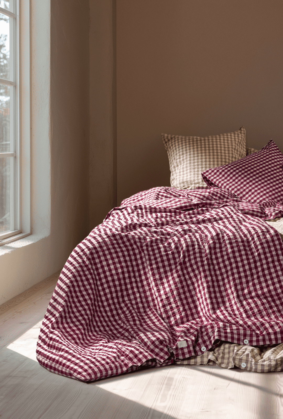 Sanseligt, behageligt, 100% økologisk og GOTS-certificeret. Sengetøjet Bæk&Bølge fra JUNA er produceret ud fra ansvarlige principper og har en helt speciel vævning med en tekstur, der vækker minder. Måske kan du huske følelsen af stoffet fra barndommen, bedsteforældrene eller sommerhusferierne? Ikke alene er der noget nostalgisk over materialet – det er også funktionelt og lader luften cirkulere mellem din hud og stoffet. Det kalder på en god nats søvn, så du kan restituere og lade op til en ny dag. Bæk&Bølge har det helt rigtige casual og naturlige udtryk, der præger tidens mode og indretningstrends. Mærk stemningen. Uperfekt på den helt perfekte måde. Sengetøjet til dyner med ekstra længde måler 140x220 cm og kommer i blomme/rosa, hvor dybde møder lethed i en smuk balance. Den mørke, forførende blommefarve tilfører et strejf af subtil luksus og sofistikeret varme, mens den støvede rosa nuance har en blød og beroligende karakter, der giver en følelse af harmoni og velvære. Inspireret af tidens længsel efter både eskapisme og jordforbindelse skaber denne farvekombination en stemning af ro og sanselig velvære – perfekt til at omfavne hverdagens små pusterum. Selvom farverne selvfølgelig har en sæsonpræget appel, er de samtidig så tidløse og raffinerede, at JUNA-sengetøjet nemt kan bruges året rundt. Og år efter år. Har du flere forskellige Bæk&Bølge-sengesæt fra JUNA, kan du lege med at blande de forskellige farver og mønstre på kryds og tværs og skabe dit eget drømmende univers i soveværelset, i sofaen, i hængekøjen, på altanen, eller hvor du nu tager din dyne og pude med hen. Du kan gøre lige, hvad du drømmer om. (GOTS ”Organic” Certified by Control Union, CU1026087)