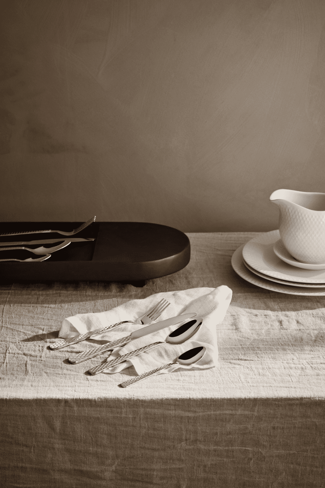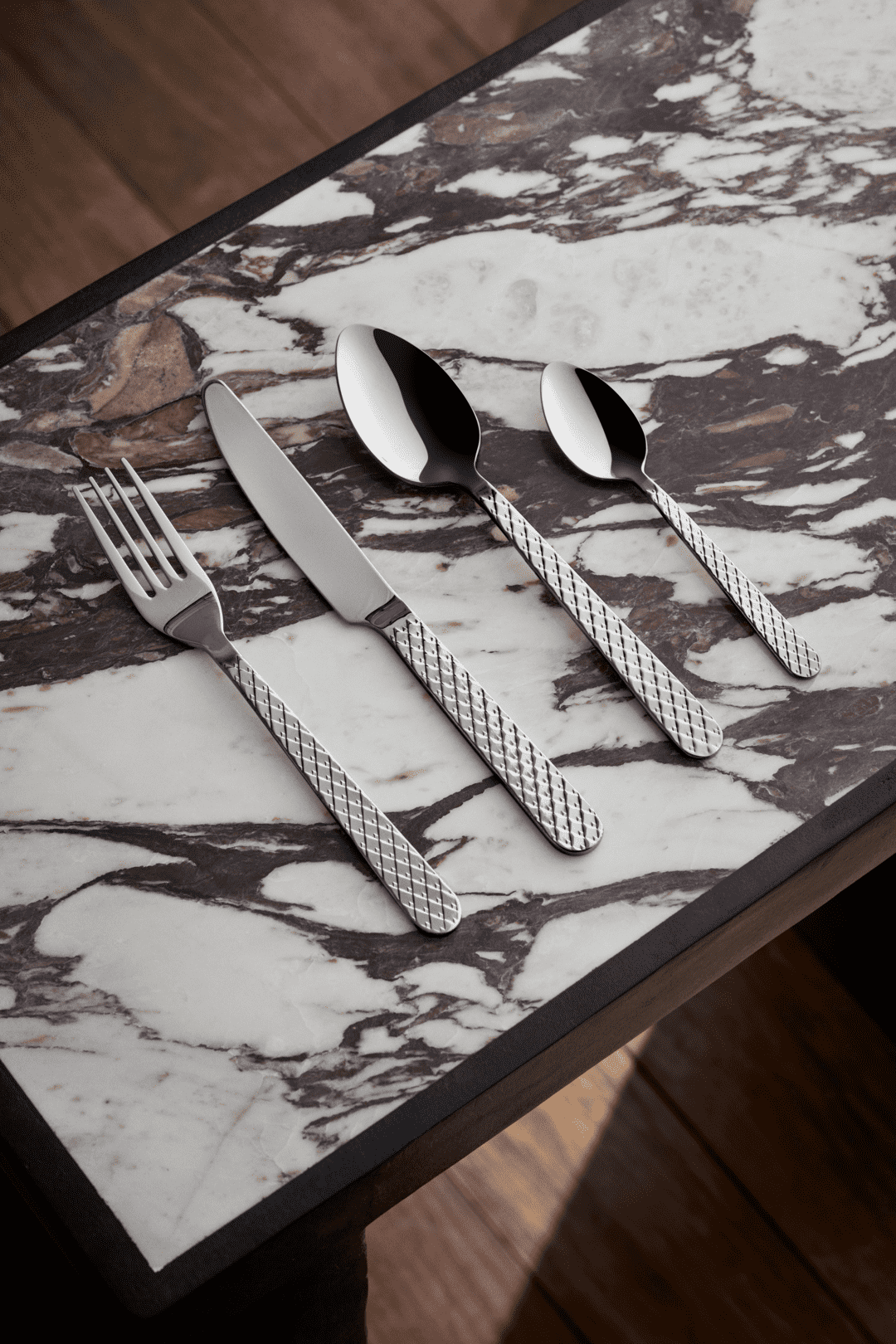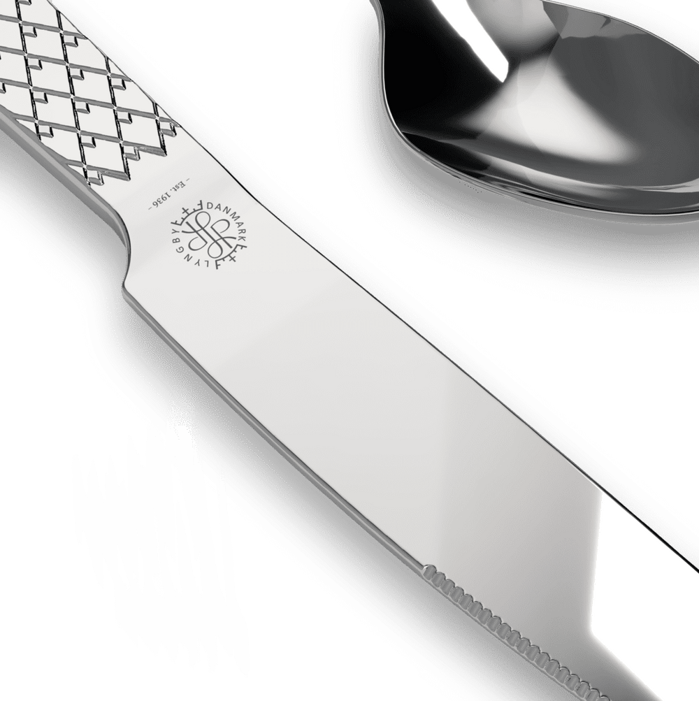 Skab samhørighed i din borddækning med den ikoniske Rhombe-signatur. Med Rhombe-bestiksættet fra Lyngby Porcelæn kan du nu få en unik helhed på tværs af alle Rhombe-serier og nyde den ekstra dybde og taktilitet, som et smukt bestiksæt i 100% genanvendt stål tilfører med sine stilrene linjer til perfektion. Hvert enkelt stykke bestik er skabt til at harmonere med detaljerne i porcelænet, så du har muligheden for at skabe præcis den følelse af luksus, der gør hvert måltid til en sublim sanseoplevelse – komponere dit eget personlige mesterværk til at fejre alle de små øjeblikke og forvandle hverdagen til noget særligt og til at gøre hver festlig sammenkomst uforglemmelig med en fuldendt stil og finesse. Kniv, gaffel, ske og teske. Fire stk. af hver. Og det velkendte grafiske Rhombe-udtryk går selvfølgelig igen på alle 16 dele i det nye bestik, hvor mønsteret ligger på skaftet og er hævet som et lavt relief, præcis som du kender det fra seriens steldele. Det er ikke kun smukt og stilfuldt, men sikrer dig også en udsøgt taktil fornemmelse i hænderne, når du holder bestikket. Du får med Rhombe-bestiksættet et strømlinet og eksklusivt design, der indbyder til, at du griber om bestikket og mærker reliefferne i hånden. Og samtidig forlænger det smukt og stilfuldt Rhombe-mønsteret ud på bordet. Den blanke finish på alle dele i bestiksættet er med til at forstærke den visuelle dybde i Rhombe-mønsteret, der med det samme fanger øjet og giver et helt unikt visuelt blikfang, du kun kan få med det originale Rhombe-design. Med en flot finish og et lille diskret logo præget i det i polerede stål matcher det både det klassiske hvide Rhombe-stel, Rhombe Earth-kollektionen og Rhombe Color-delene, og vil som noget helt nyt bidrage med at udvide hele Rhombe-seriens mange porcelænsdele med et nyt lækkert og naturligt materiale, der lader det diskrete mønster træde frem på en ny måde – og hvor kontrasten mellem det bløde formsprog og den stramme Rhombe-reflief trækker mønsterets former endnu mere tydeligt frem og skaber fokus.